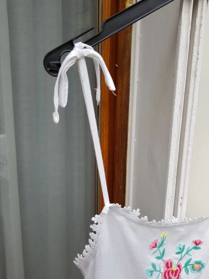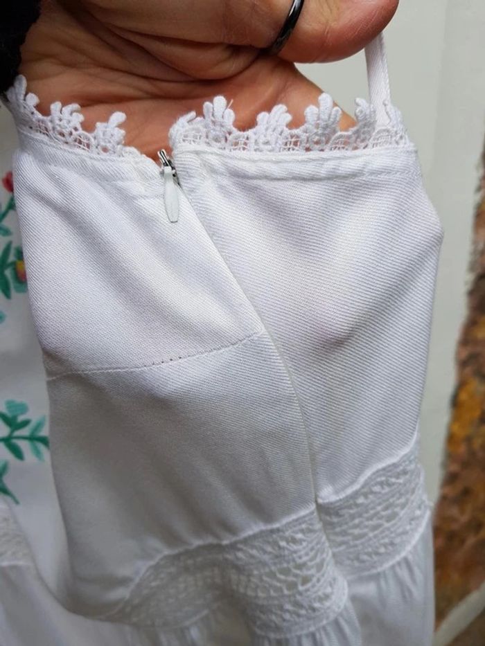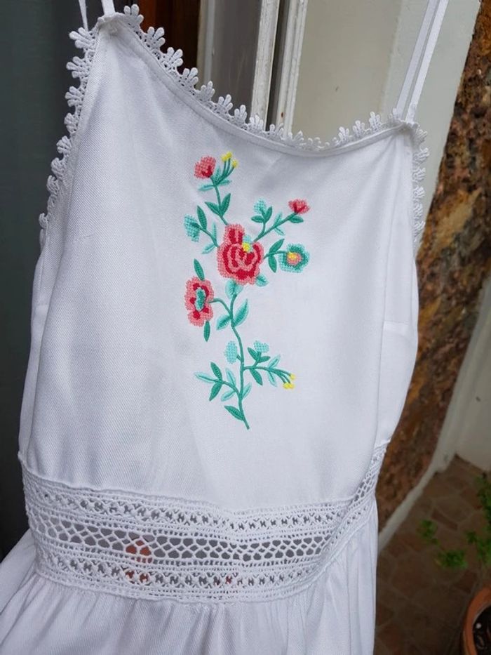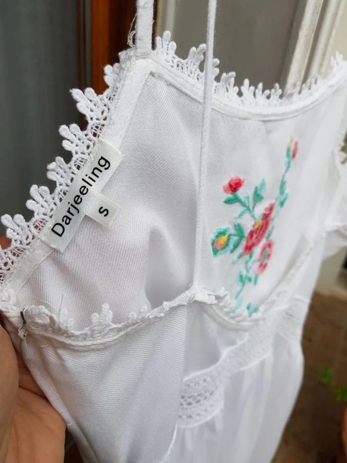Très jolie robe blanche d'été, brodée sur le devant, contour très fin et ajourée tout autour de la taille - T. S / 36 - TRÈS BON ÉTAT COMME NEUVE. #alupinerobejupefemmetaille36 #robefemme36 #robedetefemme36 #robeblanchefemme36 #robelegerefemme36 #robebretellesfemme36 #robeetedarjeeling36 #darjeeling36