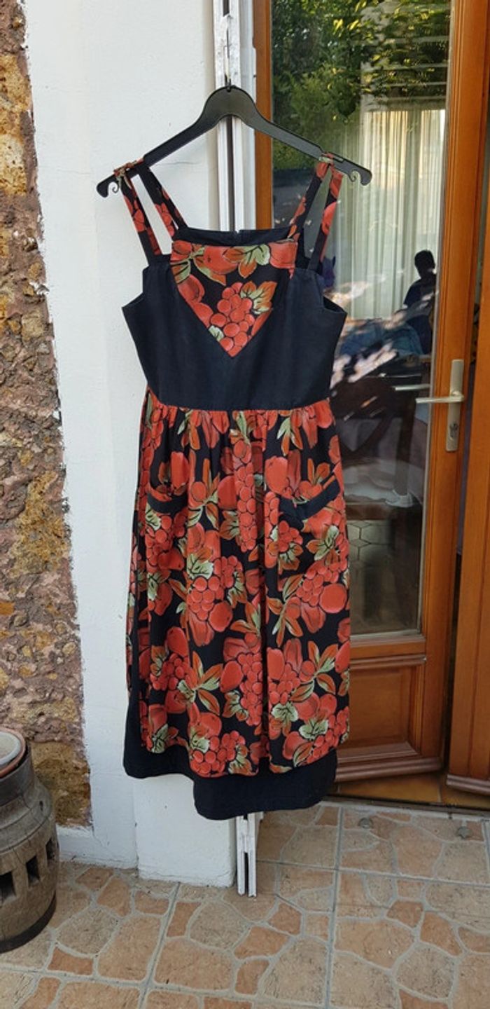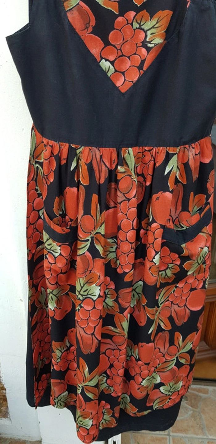 Jolie robe noire avec un joli tablier fleuri devant et derrière - T. 36 - TRÈS BON ÉTAT. #alupinerobejupefemmetaille36 #robefemme36 #robesansmanchesfemme36 #robeavecbretellesfemme36 #robeabretellesfemme36
