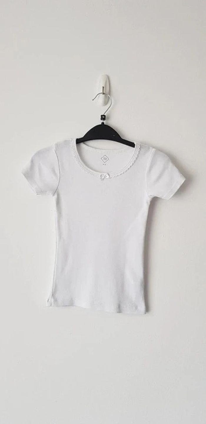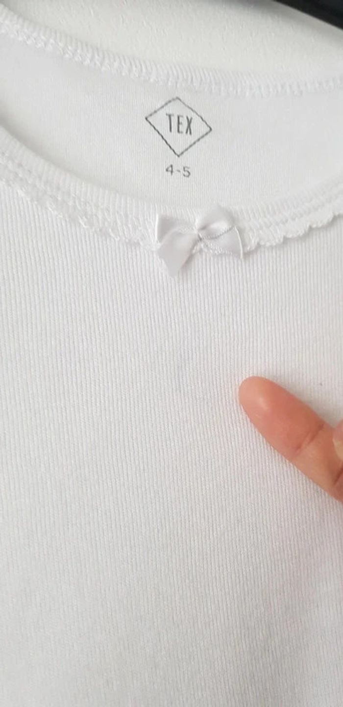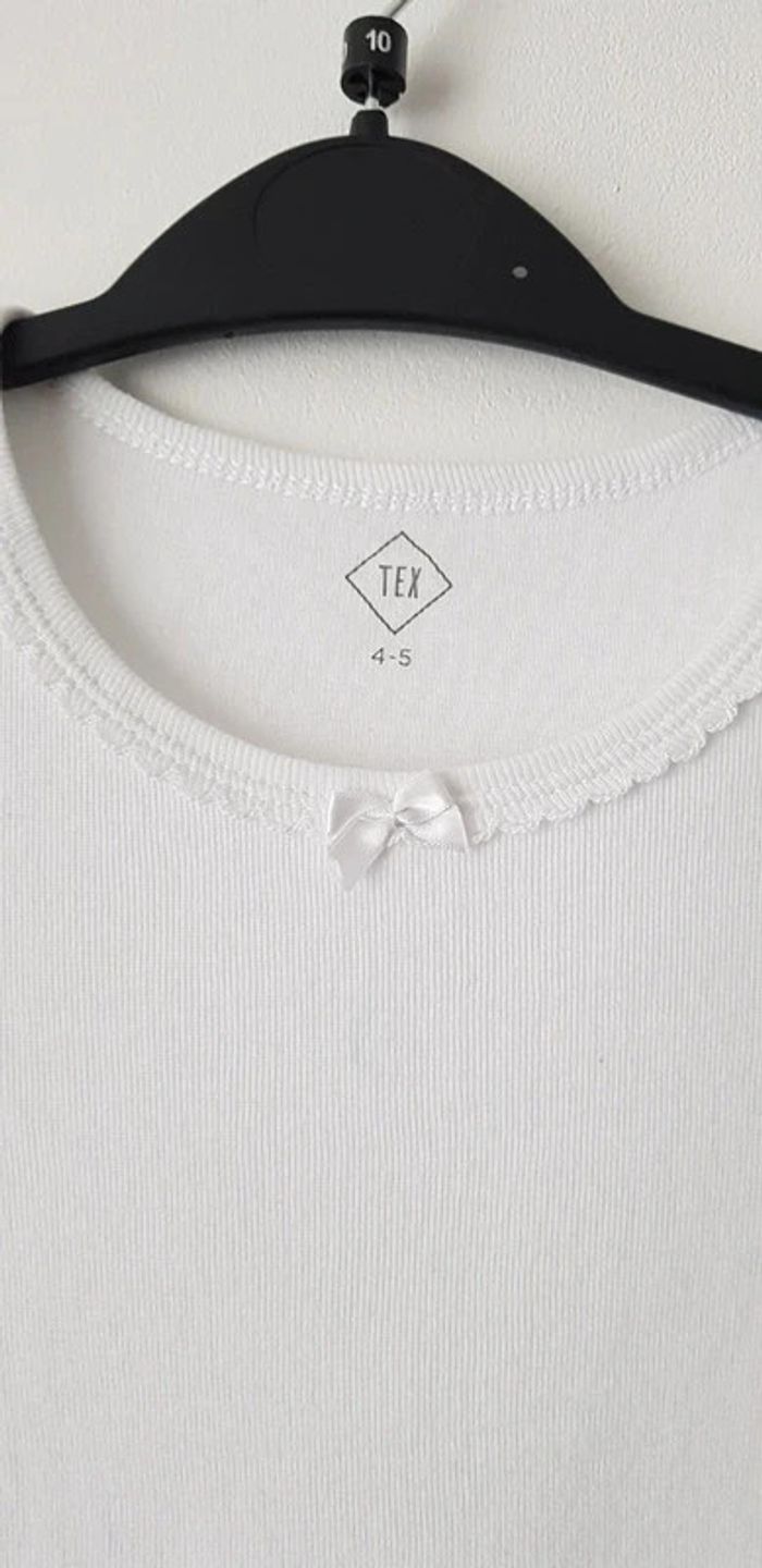 Tee-shirt manches courtes blanc, petit nœud sur le col de devant - T. 4 / 5 ans - TRÈS BON ÉTAT juste une petite ombre pas très visible voir photo. #alupineteeshirtfilletaille4ans #teeshirtfille4ans5ans #teeshirtfille4ans #teeshirtmanchescourtesfille4ans5ans #teeshirtmanchescourtesfille4ans #teeshirttexfille4ans #teeshirtmanchescourtestexfille4ans #texfille4ans #tex