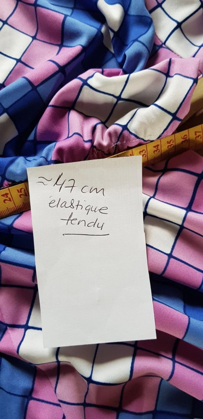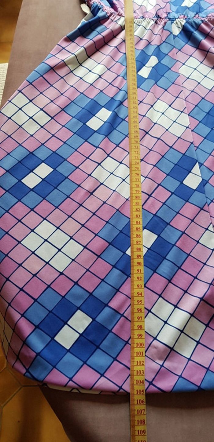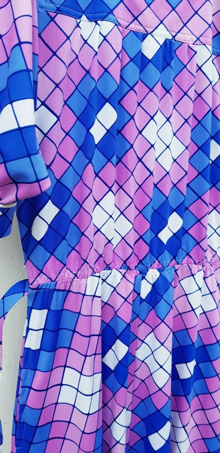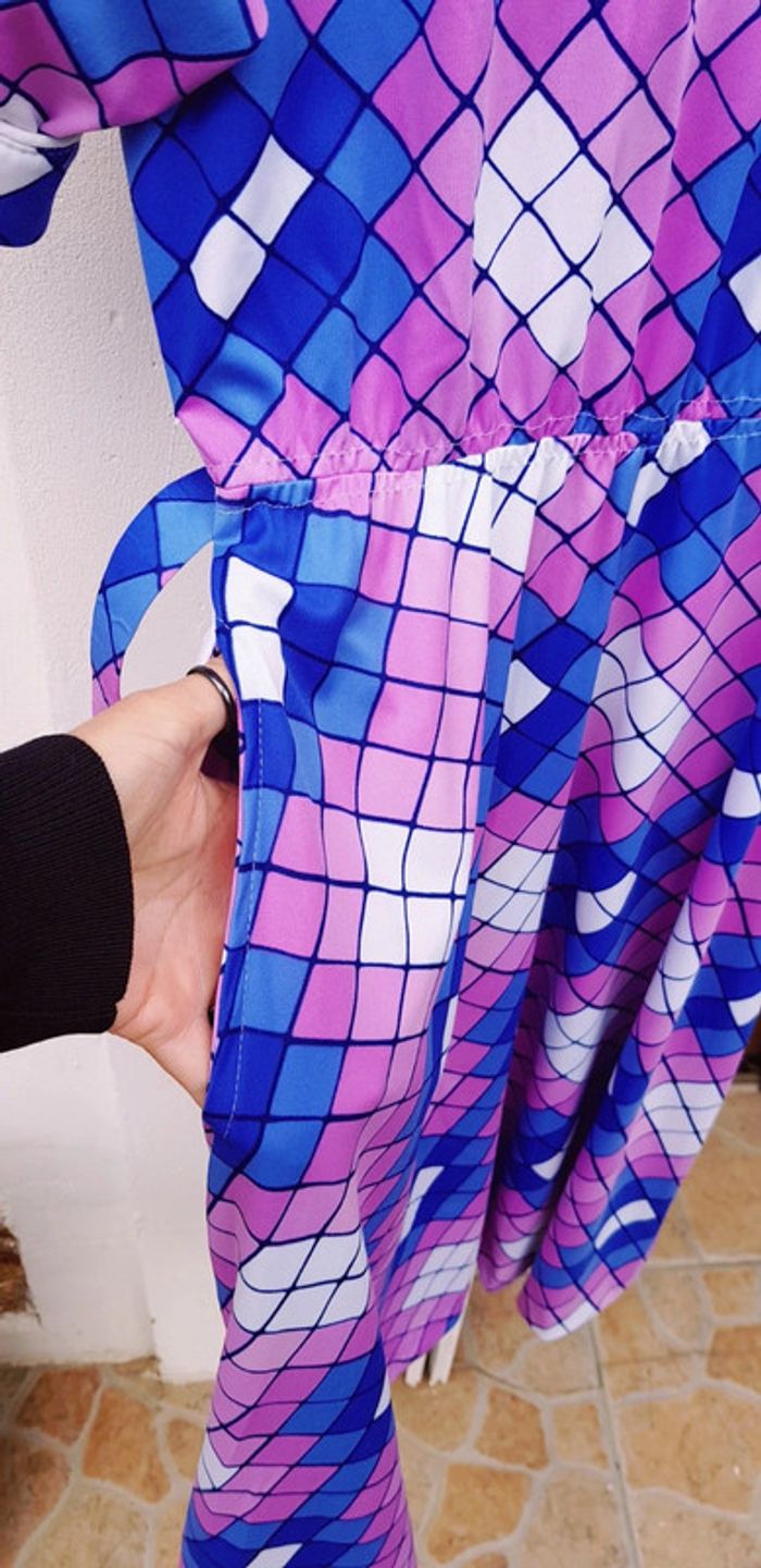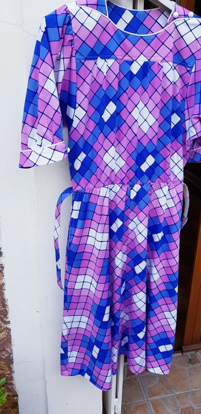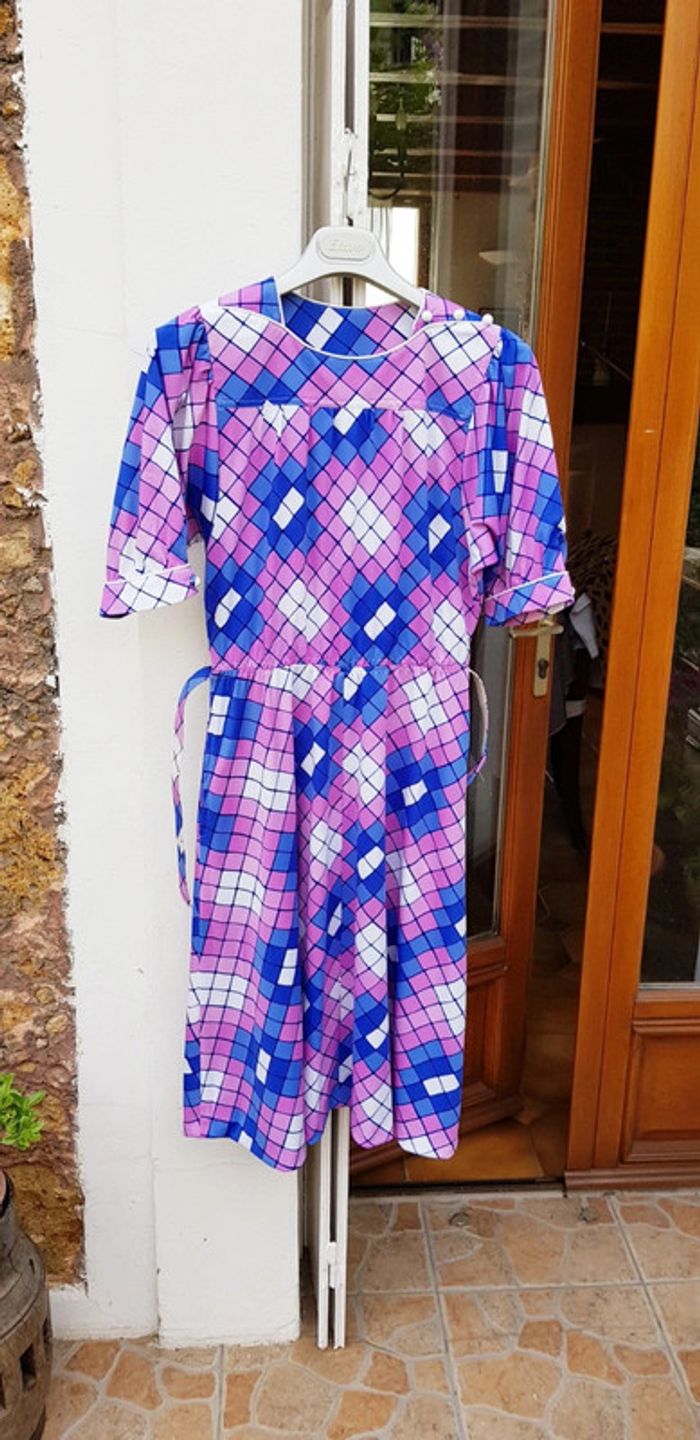 Robe vintage mi longue manches courtes avec ceinture de couleur bleu, rose, blanc...avec la taille élastiquée - T. 38 / 40 - Porté, 1 petite reprise derrière en bas de robe peu visible mais reste en TRÈS BON ÉTAT dans l'ensemble. #alupinerobejupefemmetaille38 #robefemme38 #robevintagefemme38 #robemilonguefemme3840 #vintagefemme #vintage