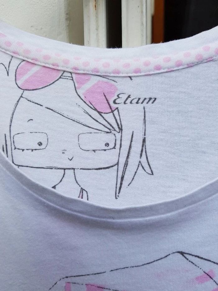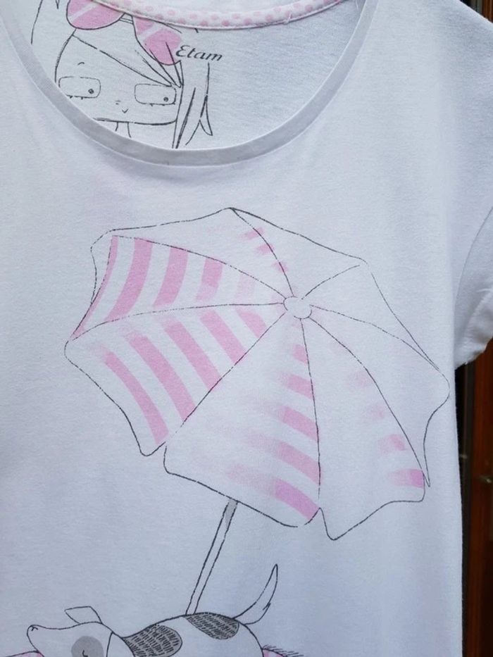 Haut de pyjama manches courtes ou tee-shirt au choix blanc imprimé en très bon état (couleur rose effacée d'origine) - T. XS - Juste une petite tâche à peine visible sinon TRÈS BON ÉTAT. #alupinepyjamafillexs #hautdepyjamafillexs #hautdepyjamamanchescourtesfillexs #hautdepyjamaetamfillexs #etamfillexs #etam