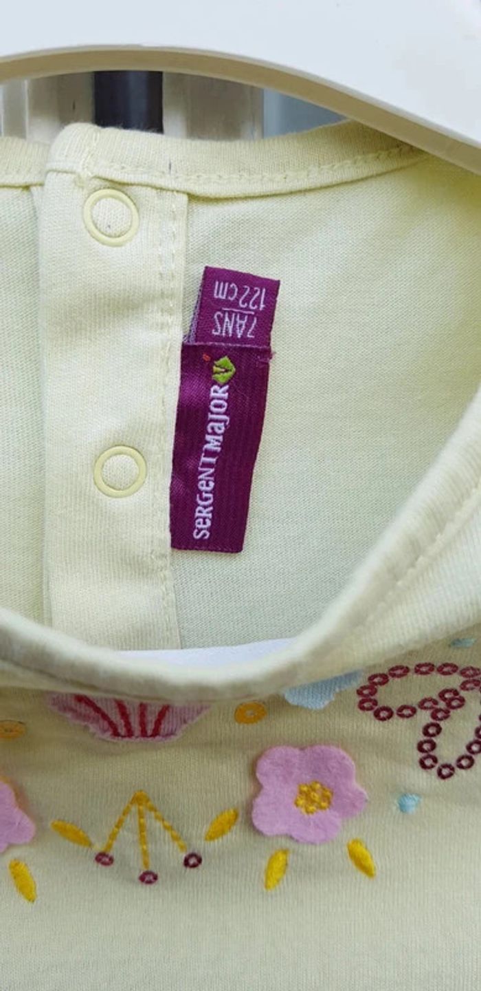 Tee-shirt jaune manches courtes froufroutées, col avec ornements - T. 7 ans - TRÈS BON ÉTAT. #alupineteeshirtfilletaille7ans #teeshirtfille7ans #teeshirtsergentmajorfille7ans #teeshirtmanchescourtesfille7ans #teeshirtmanchescourtessergentmajorfille7ans #sergentmajorfille7ans #sergentmajor
