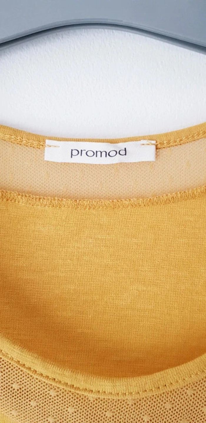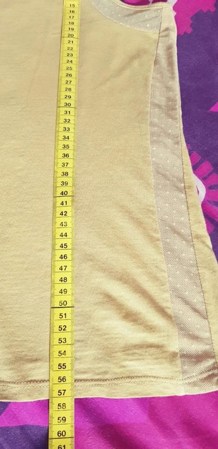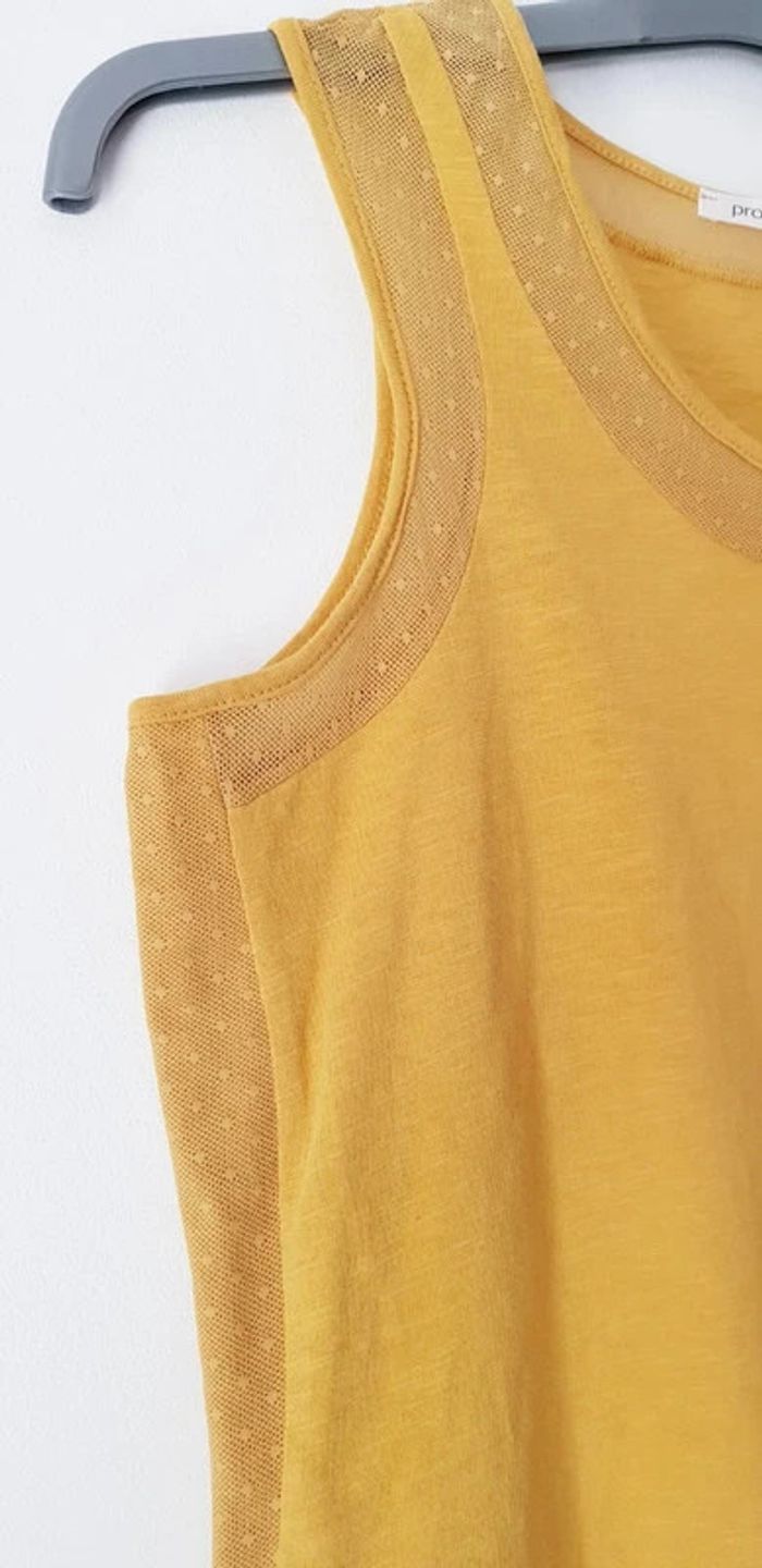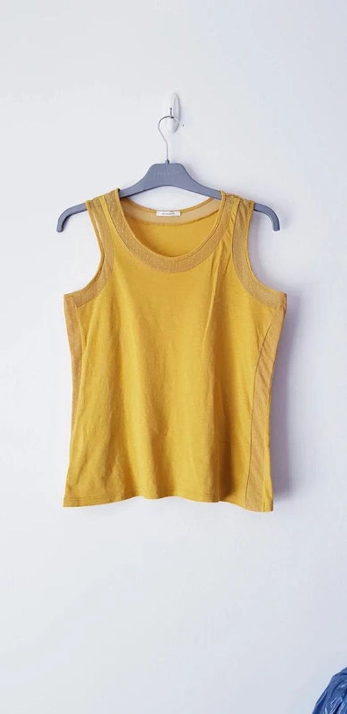 Débardeur moutarde, avec tulle sur les côtés et sur le col - T. 40 indiqué T. 38 mais convient à un 40 - TRÈS BON ÉTAT. #alupinehautfemmetaille40 #alupineteeshirtfemmetaille40 #debardeurfemme40 #debardeurpromodfemme40 #promodfemme40 #promod
