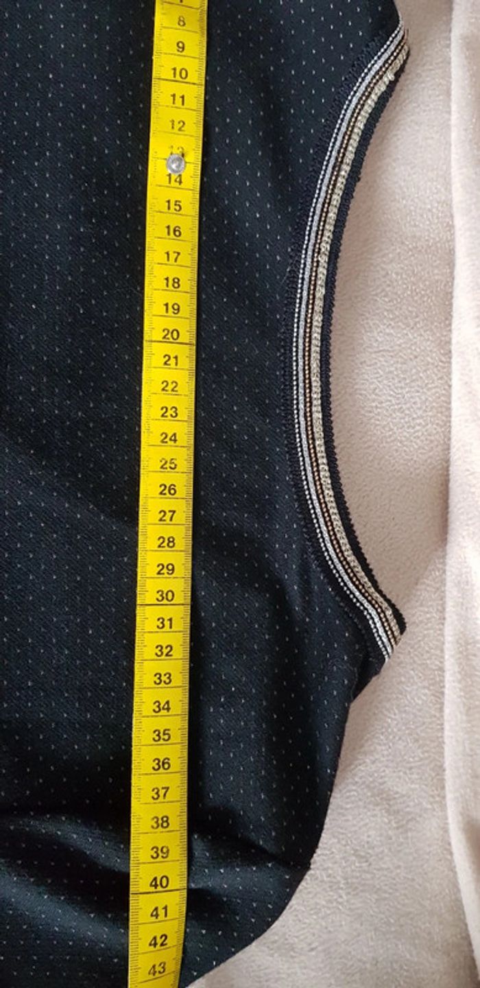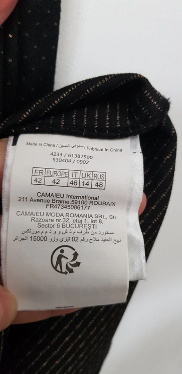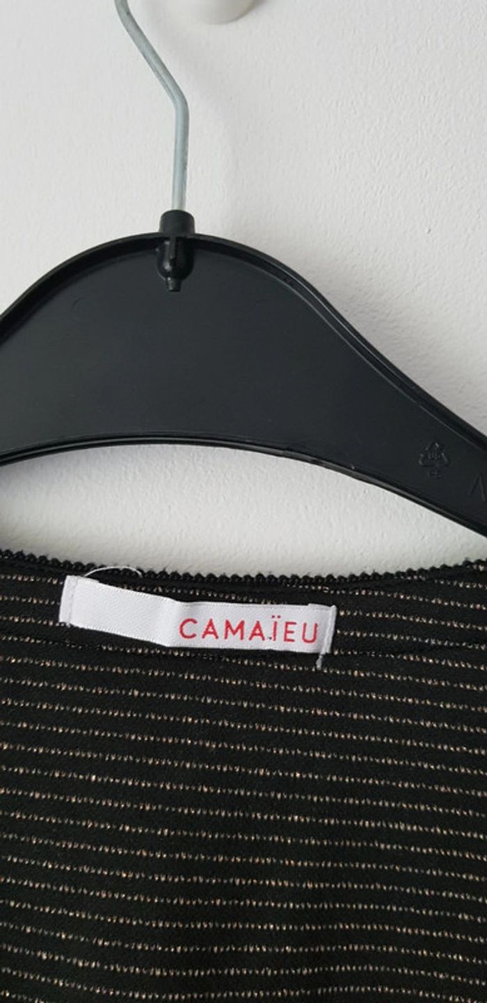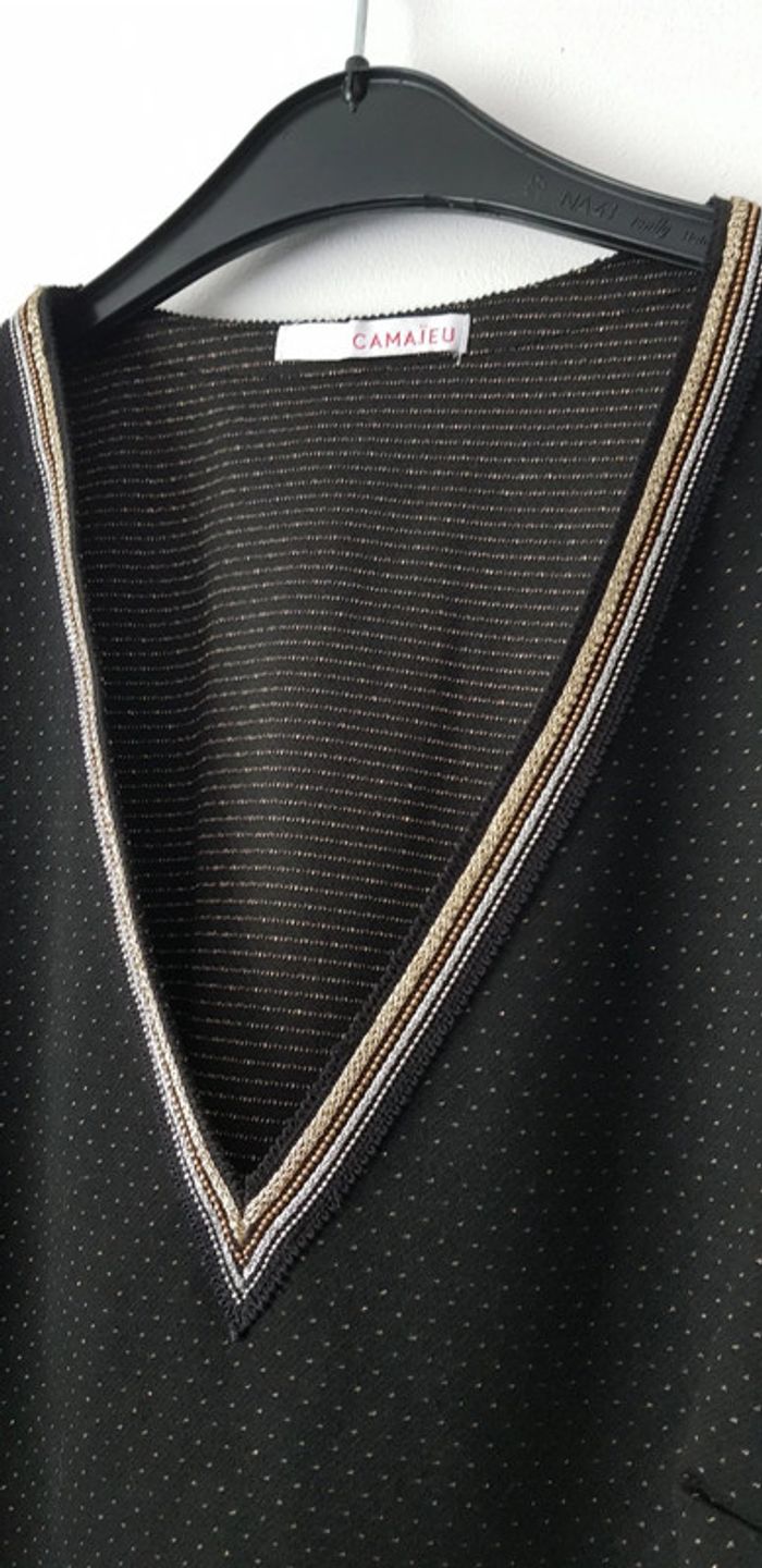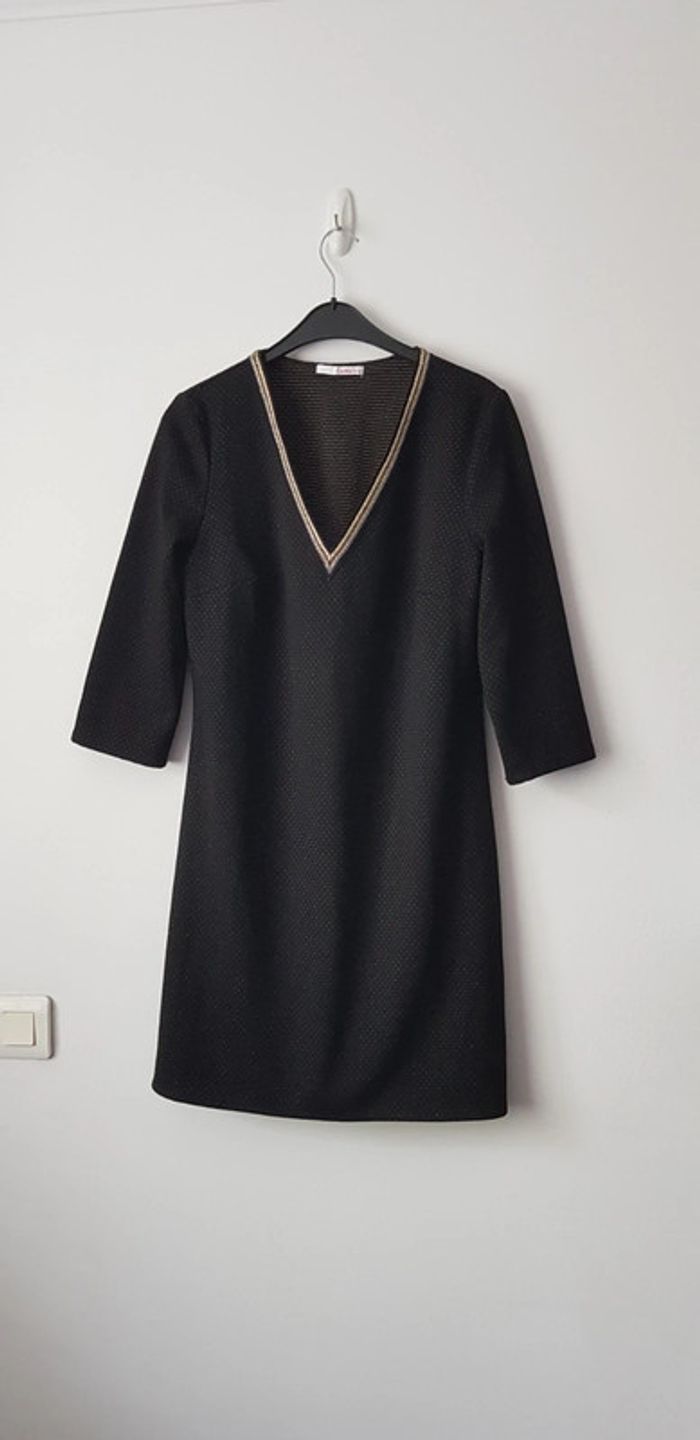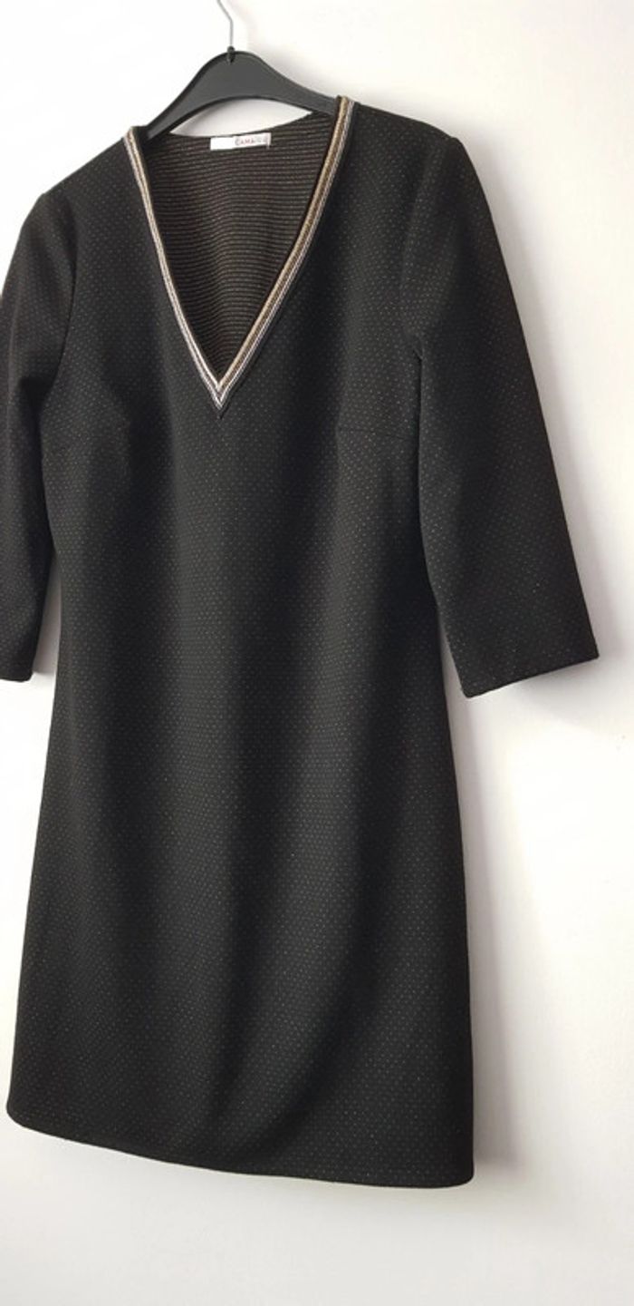 Robe noire aux lignes dorées à manches 3 quart et grand col V - T. 42 - TRÈS BON ÉTAT COMME NEUVE. #alupinerobejupefemmetaille42 #robefemme42 #robemanches3quartfemme42 #robecamaieufemme42 #robemanches3quartcamaieufemme42 #camaieufemme42 #camaieu