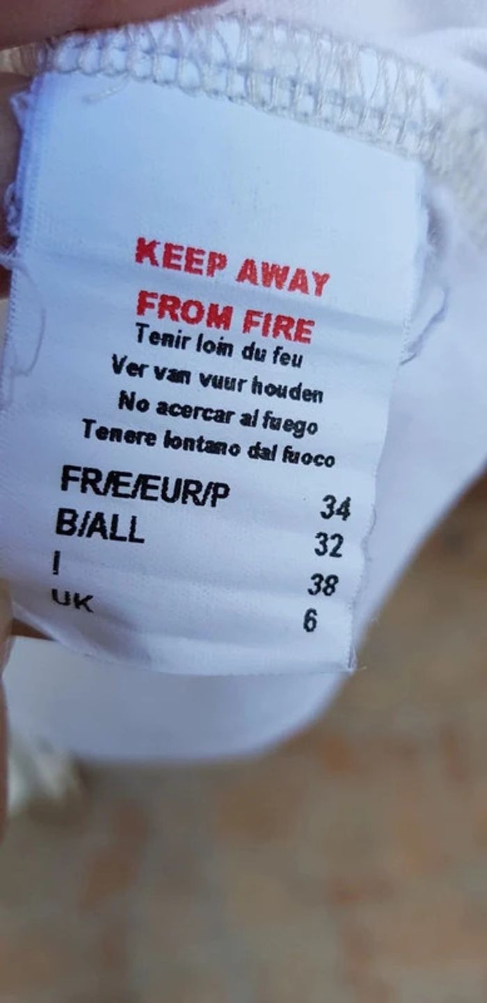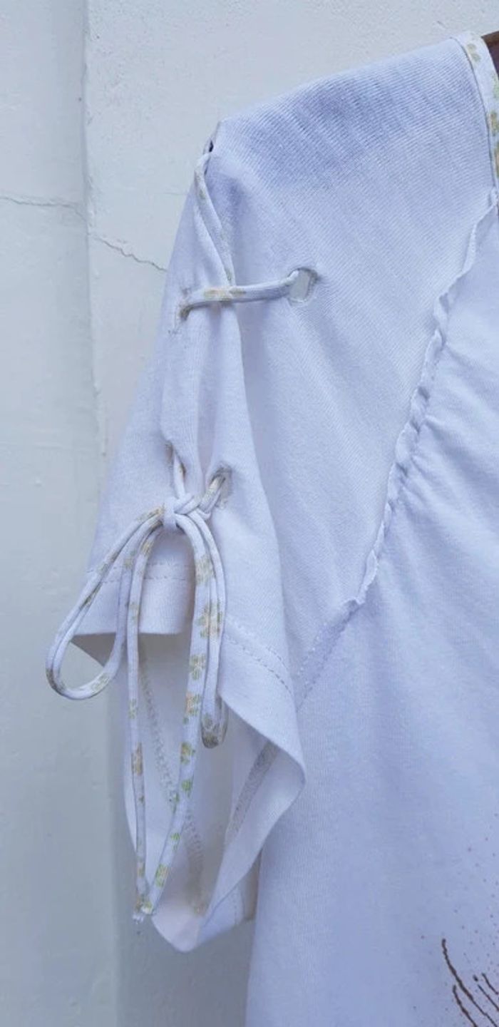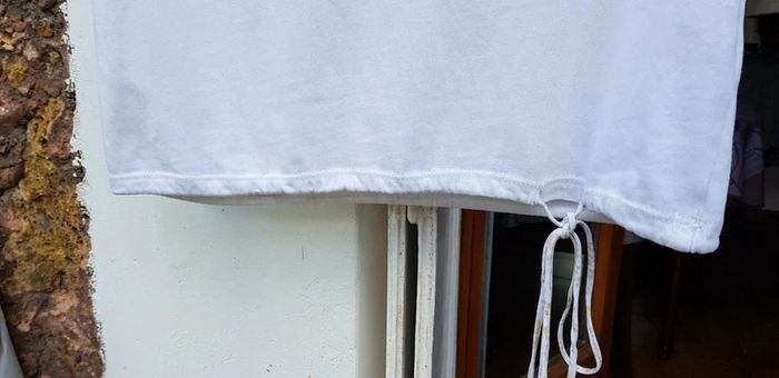 Tee-shirt manches courtes blanc, flocage en très bon état. Manches avec liens et taille avec liens de serrage - T. 34 - Porté mais reste en TRÈS BON ÉTAT dans l'ensemble. #alupineteeshirtfemmetaille34 #teeshirtfille34 #teeshirtmanchescourtesfille34 #teeshirtetamfille34 #etamfille34 #teeshirtfemme34 #teeshirtfillexs #etamfillexs #etamfemmexs #etamfemme34 #teeshirtmanchescourtesfemme34 #etam