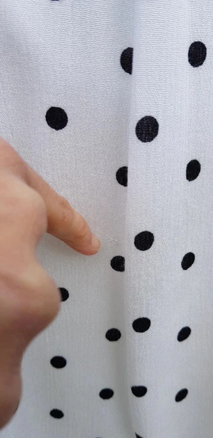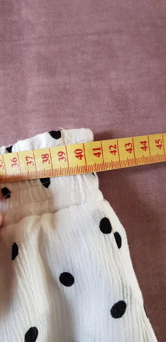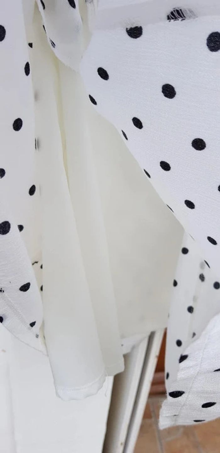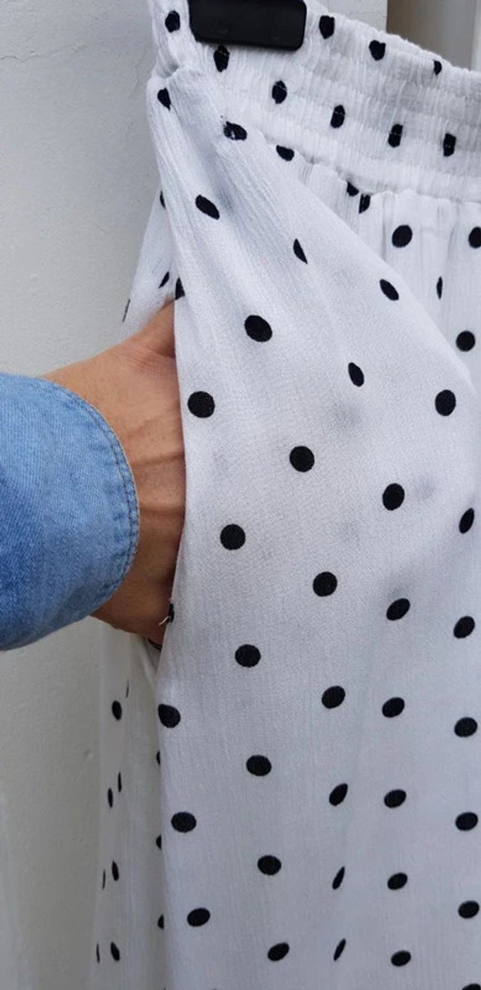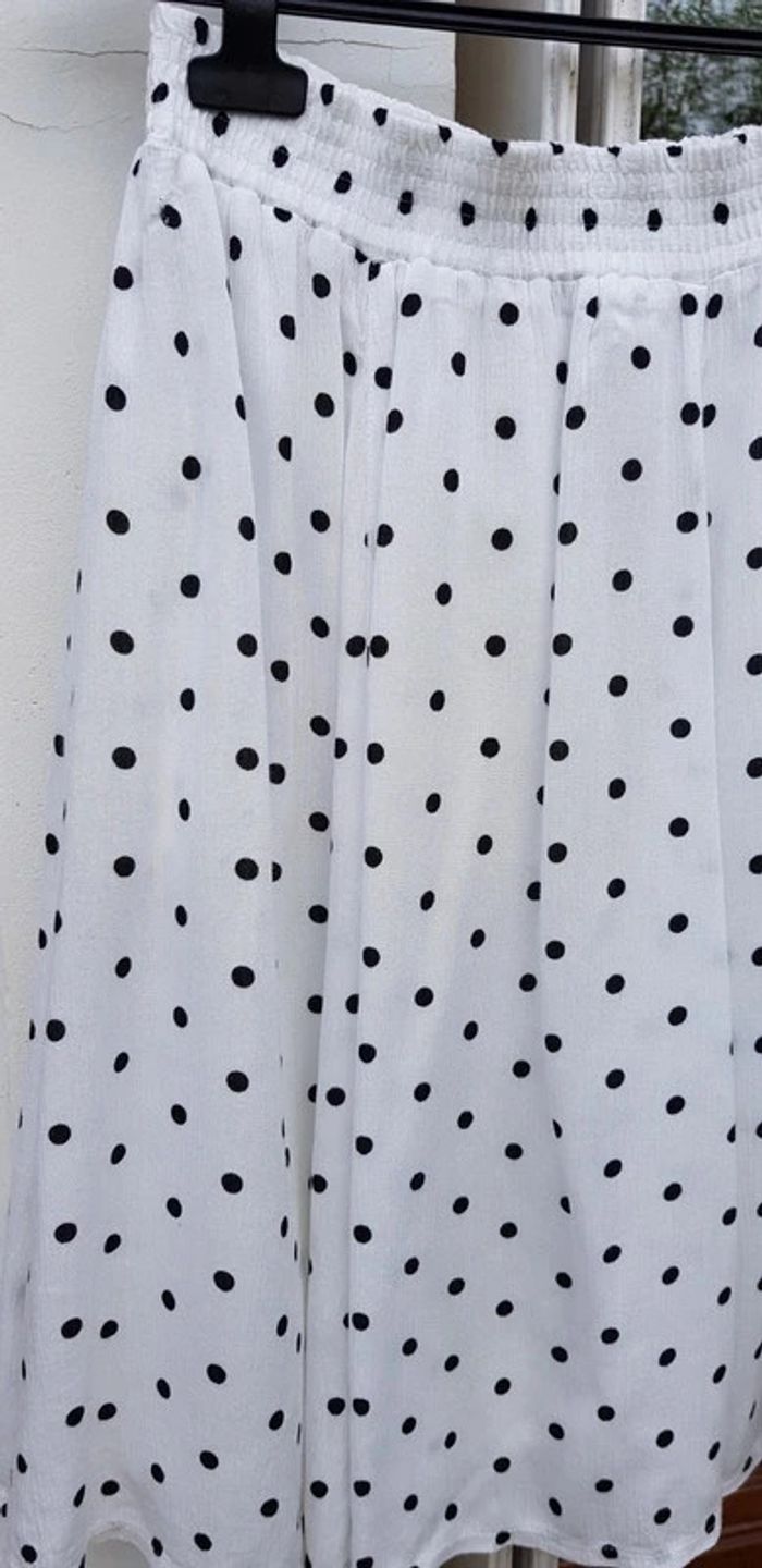 Jupe mi-longue vintage, blanche à pois noirs, légère, avec taille élastiquée, doublure et poches - T. 40 - Une petite reprise mais pas bien visible (voir photo) sinon en TRÈS BON ÉTAT COMME NEUVE. #alupinerobejupefemmetaille40 #jupefemme40 #jupemilonguefemme40 #jupevintagefemme40 #jupemilonguevintagefemme40 #jupeblancheapoisfemme40 #vintagefemme #vintage
