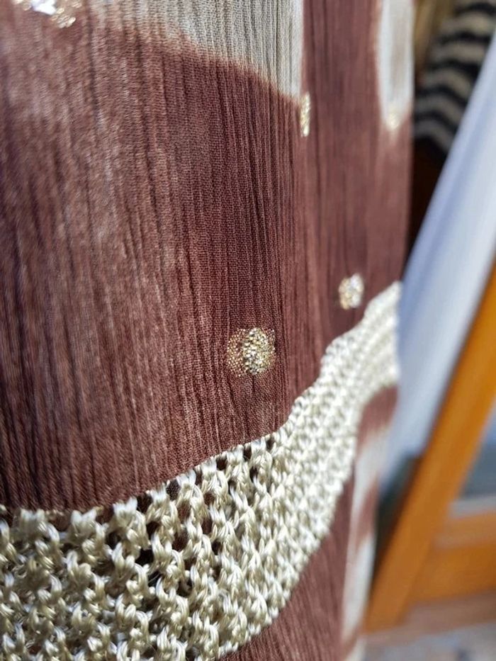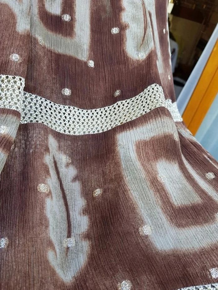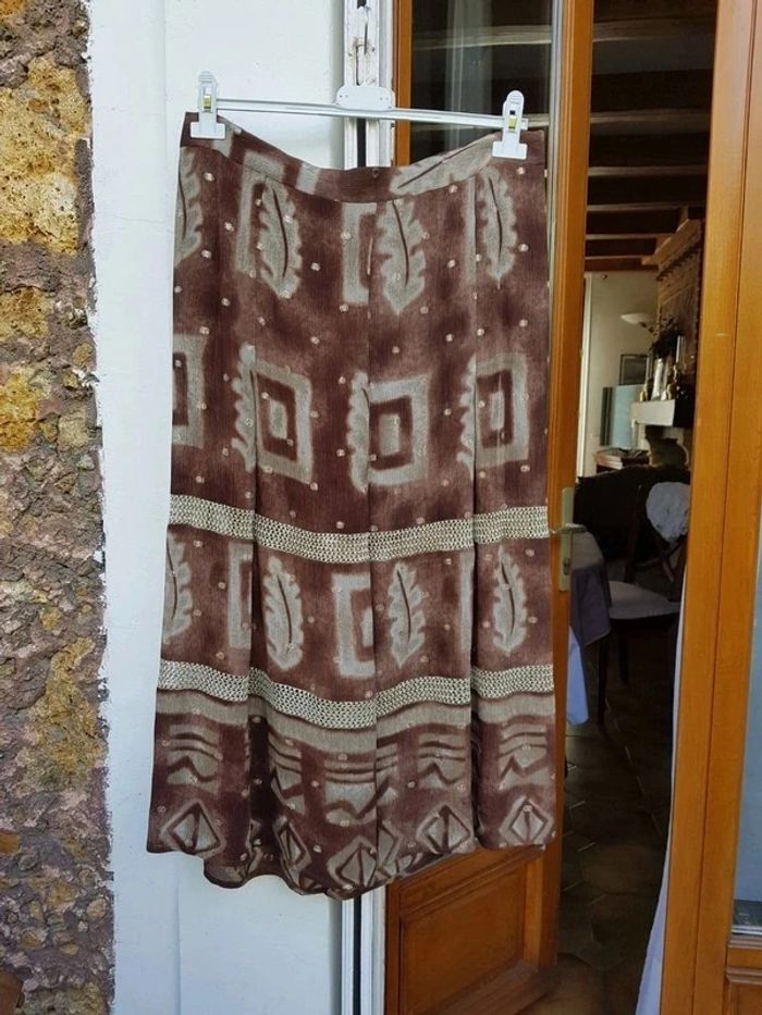 Jupe longue marron, 2 parties ajourées beiges et petits pois brillant. Fabriqué en Italie. Dimensions voir photos - T. 42 - TRÈS BON ÉTAT. #alupinerobejupefemmetaille42 #jupelonguesfemme42 #jupelonguemarronfemme42 #jupelegerefemme42 #jupefemme42 #jupegrandifemme42 #grandifemme42 #grandi