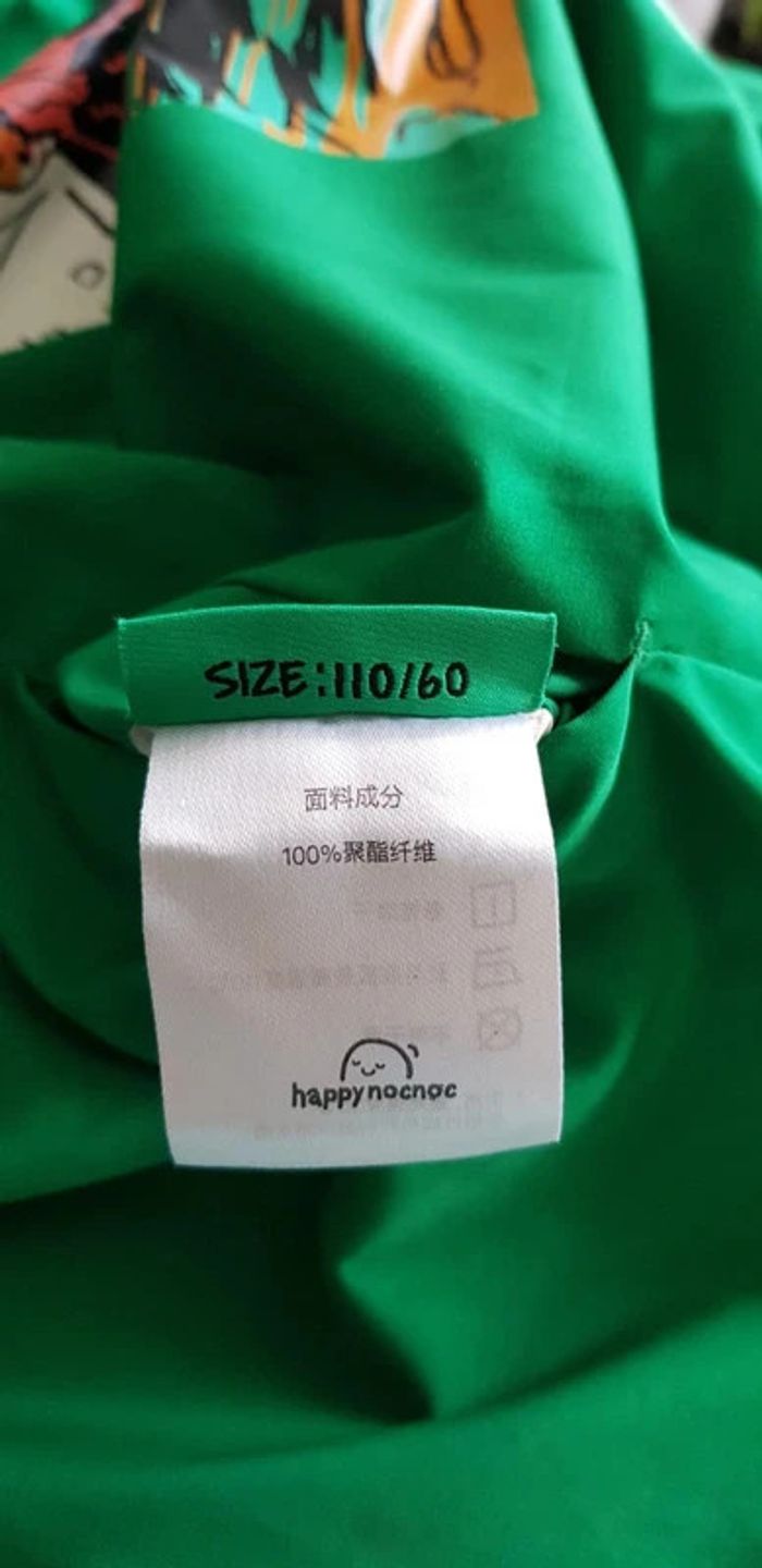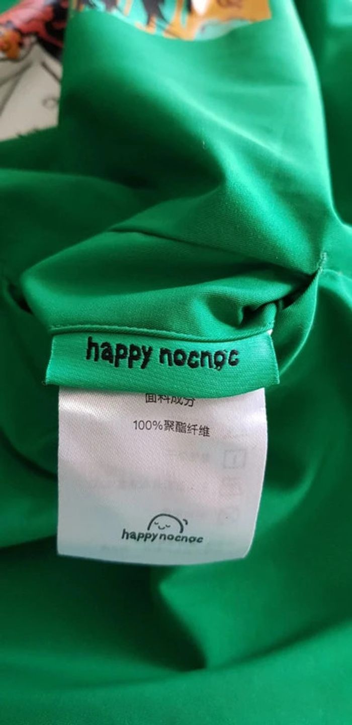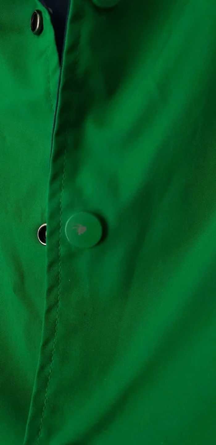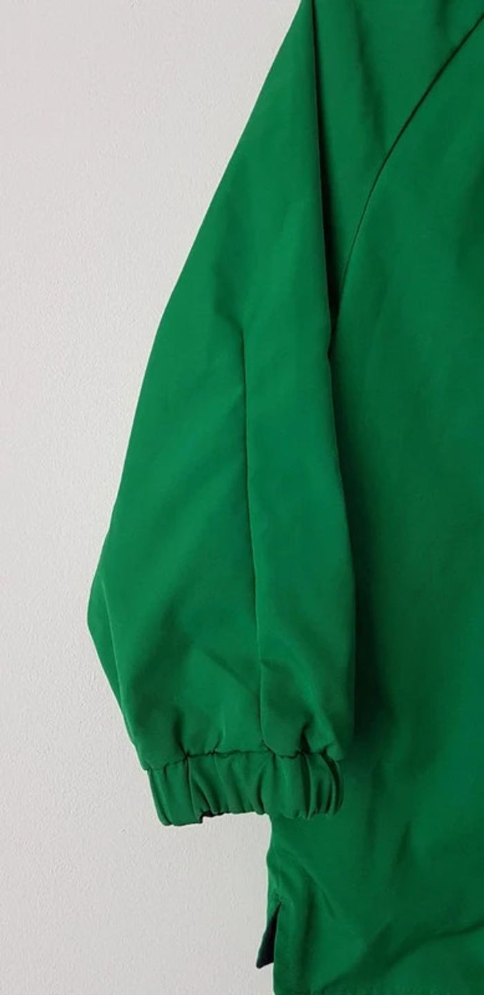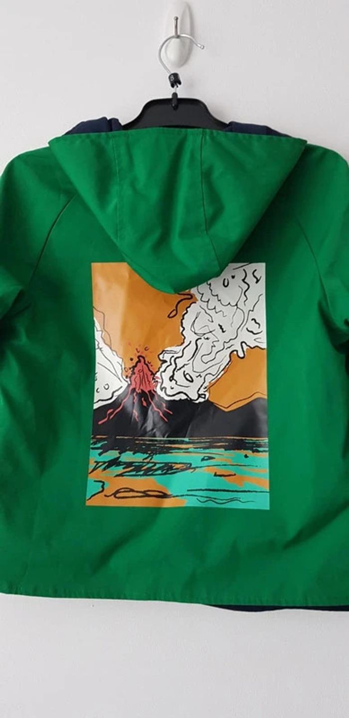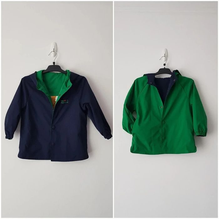 Imperméable réversible, 1 côté bleu marine et de l'autre vert avec un flocage dans le dos - T. 5 ans - Un tout petit éclat de peinture enlevé sur un bouton et une reprise sur le bras mais reste en TRÈS BON ÉTAT dans l'ensemble. #alupinevestefille5ans #vestefille5ans #impermeablefille5ans #coupeventfille5ans #vestehappynocnocfille5ans #impermeablehappynocnocfille5ans #happynocnocfille5ans #happynocnoc