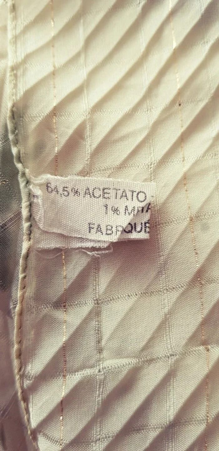 Foulard rectangulaire d'un jaune clair-vin blanc aux fils dorés. Dimensions env. 133 x 27 cm - TRÈS BON ÉTAT. #alupineaccessoiresfemme #foulardfemme #foulard