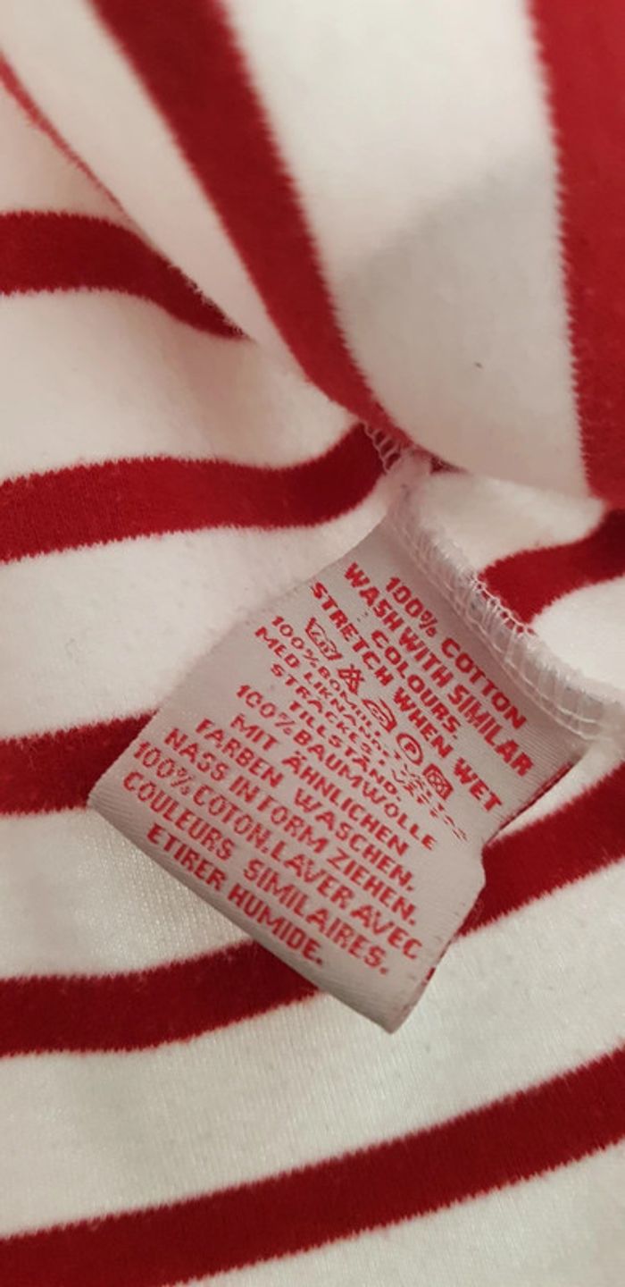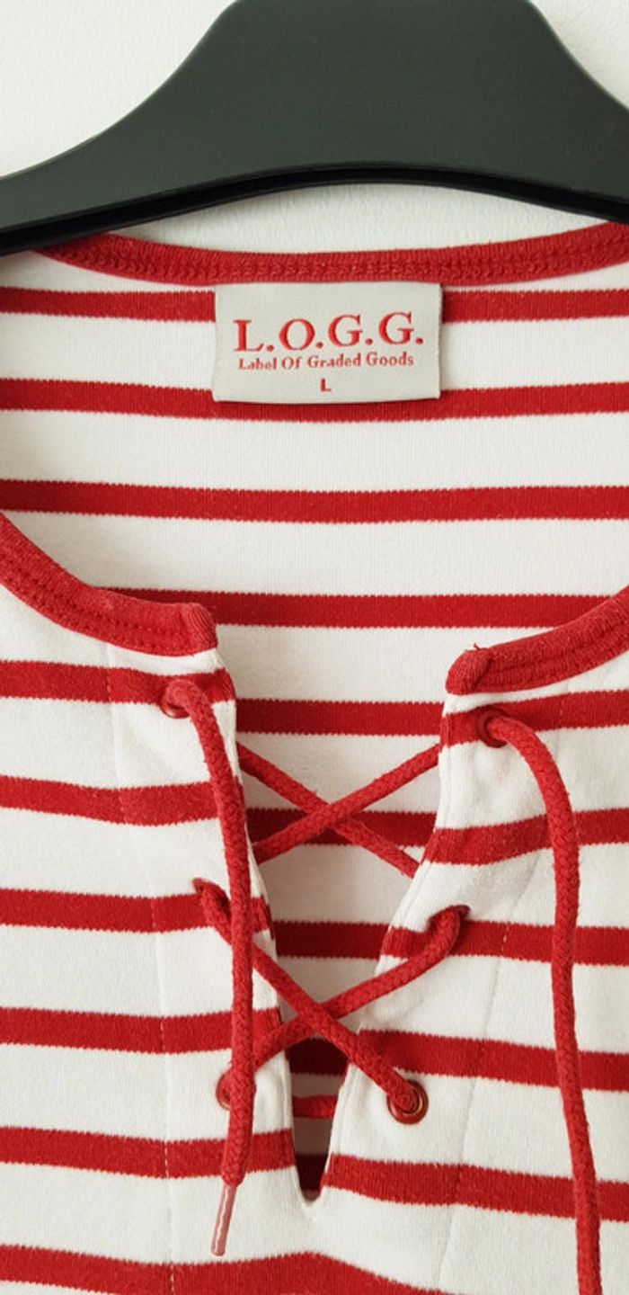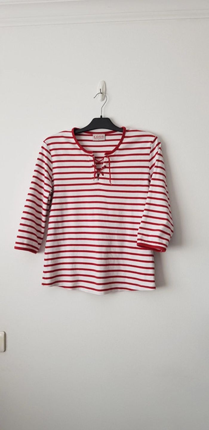 Tee-shirt style marinière à rayures rouge et crème, col rond et V avec laçage et manches mi longues - T. 40 - TRÈS BON ÉTAT. #alupineteeshirtfemmetaille40 #teeshirtfemme40 #teeshirtmanchemilonguesfemme40 #teeshirtmanches3quartfemme40 #teeshirtmarinierefemme40 #teeshirtloggfemme40 #teeshirtmanches3quartloggfemme40 #teeshirtmariniereloggfemme40 #teeshirthmfemme40 #teeshirtmanches3quarthmfemme40 #hmfemme40 #loggfemme40 #hm #logg