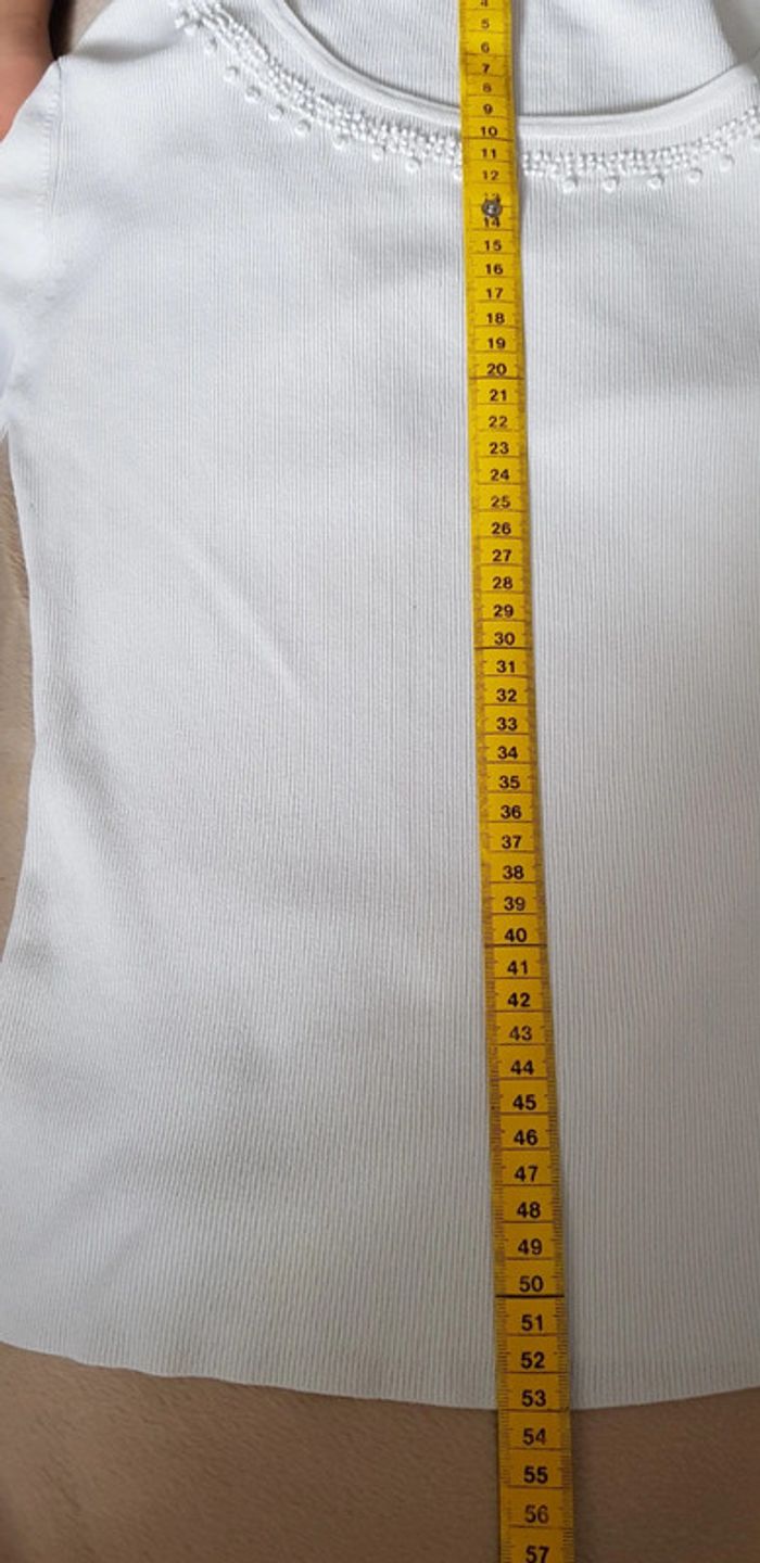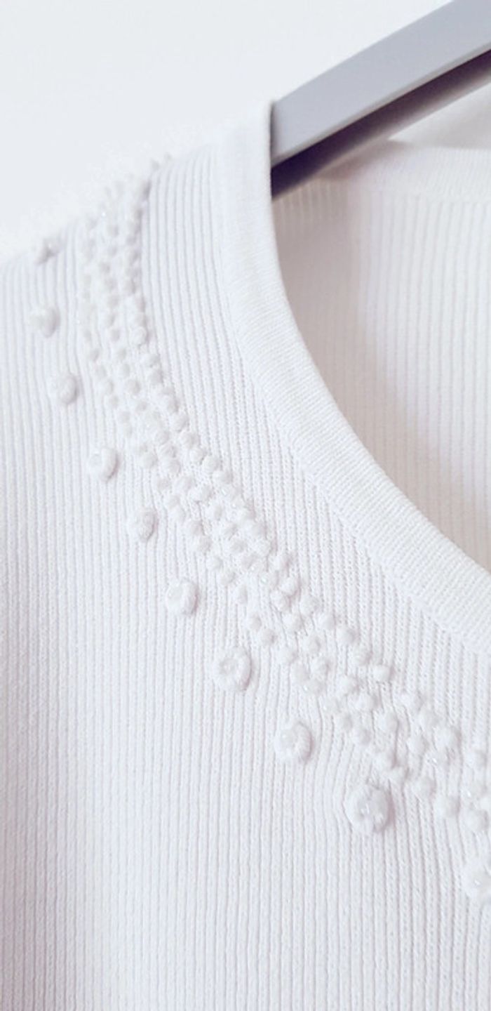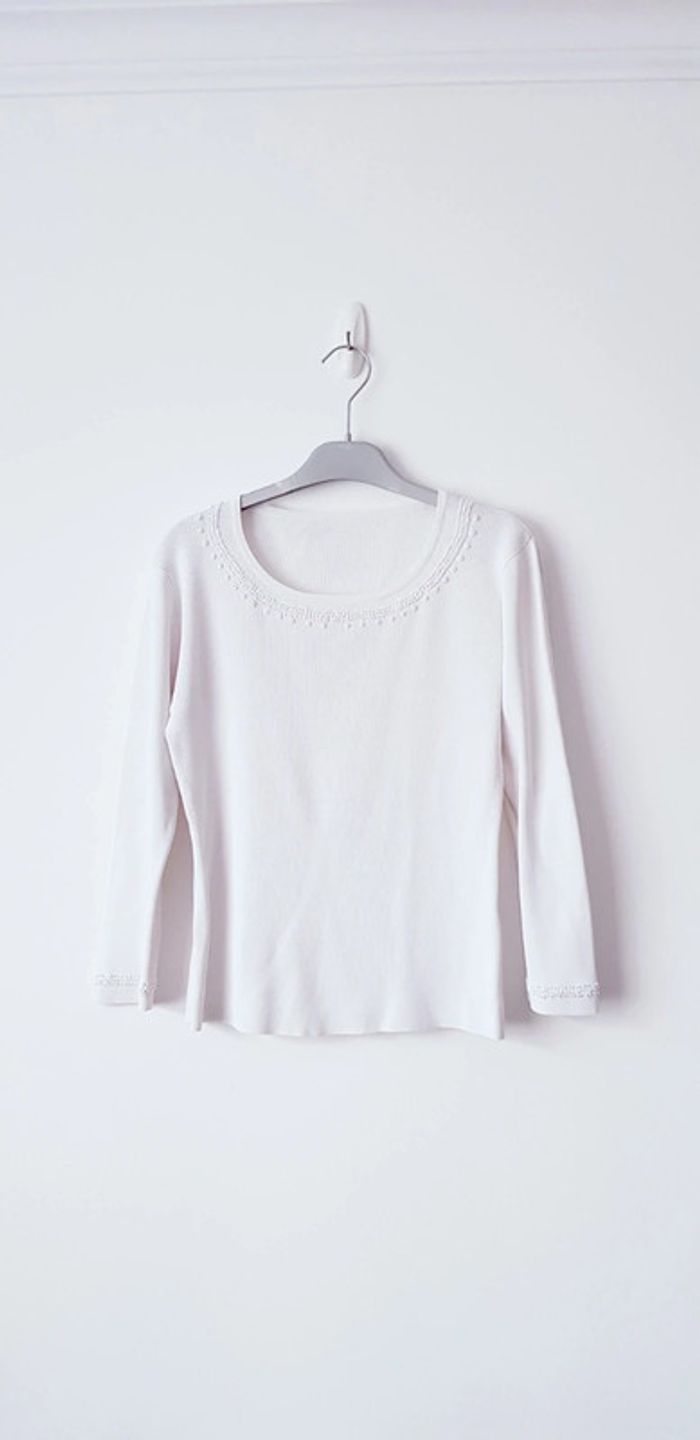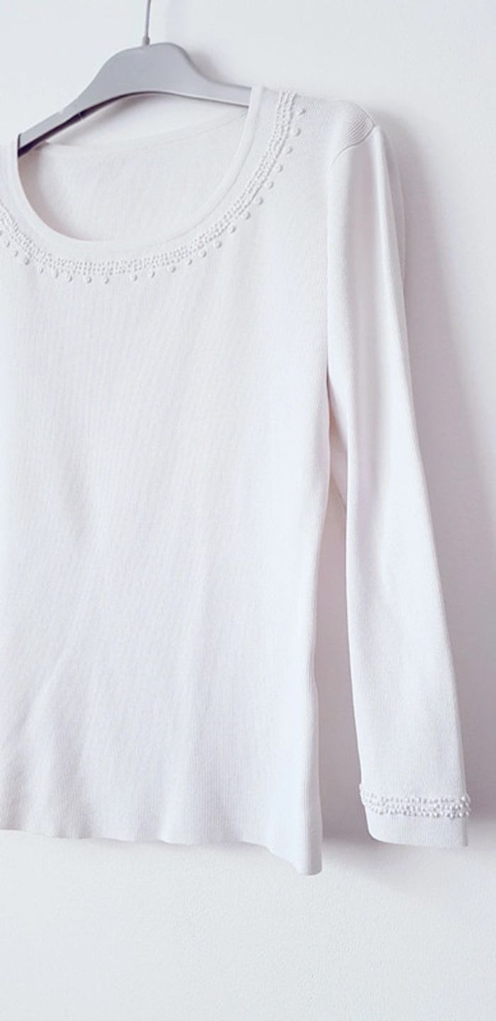 Tee-shirt blanc manches mi longues, orné sur les manches et le col de petites boules certaines perlées - T. 38 indiqué T. T.U mais reste juste - Juste une petite reprise sur une manche comme sur la photo sinon reste en TRÈS BON ÉTAT. #alupineteeshirtfemme38 #hautfemme38 #teeshirtfemme38 #hautfemme38 #teeshirtmanchesmilonguesfemme38 #hautmanchesmilonguesfemme38