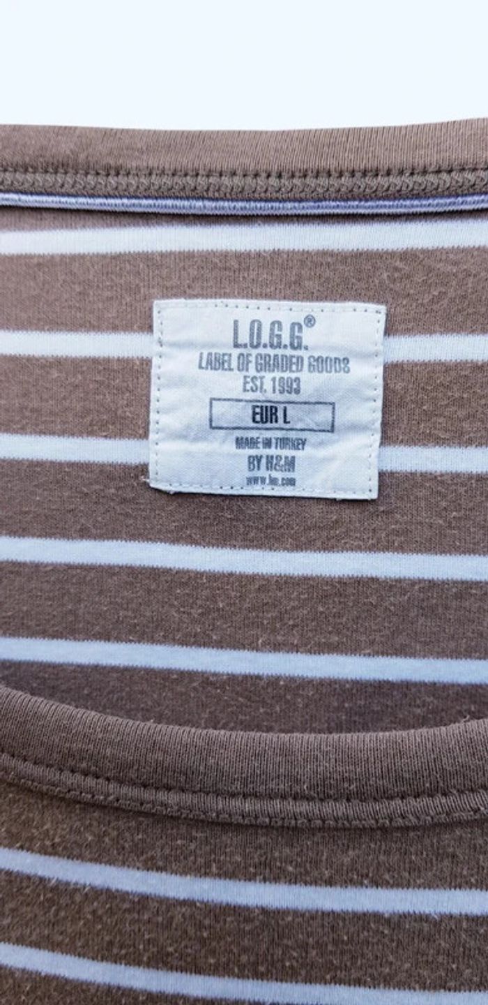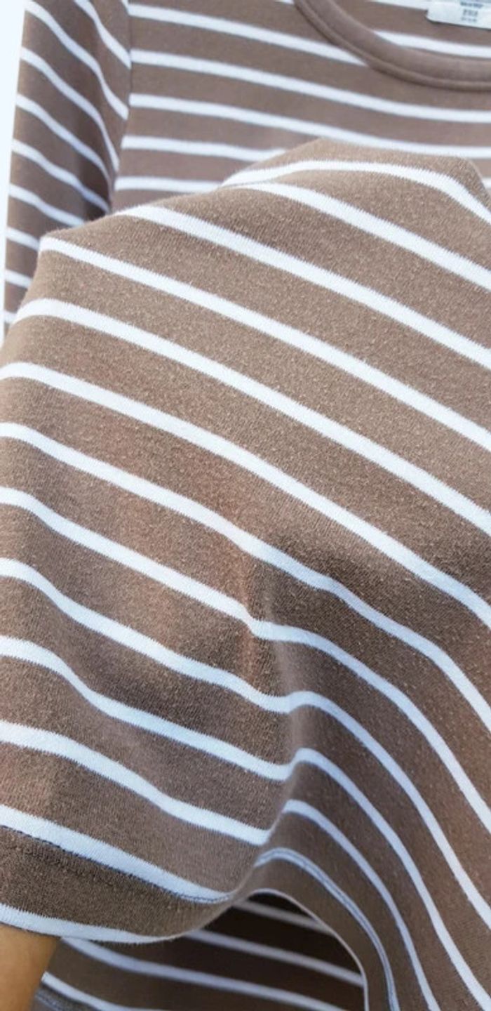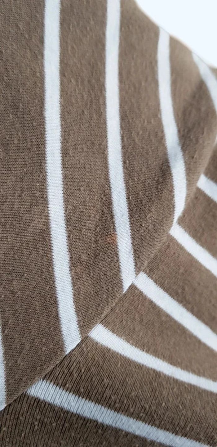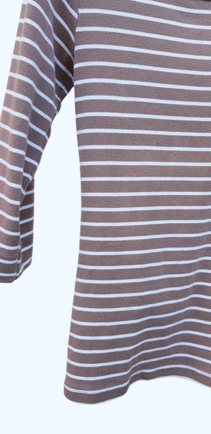 Tee-shirt manches mi longues à rayures marron et blanc retroussables - T. 40 - Porté, 1 tâche de décoloration sur une manche et une décoloration dans le cou, voir photos, mais reste en BON ÉTAT dans l'ensemble. #alupineteeshirtfemmetaille40 #teeshirtfemme40 #teeshirtmanchesmilonguesfemme40 #teeshirtloggfemme40 #teeshirthmfemme40 #teeshirtmanchesmilongueshmfemme40 #teeshirtmanchesmilonguesloggfemme40 #loggfemme40 #hmfemme40 #logg #hm