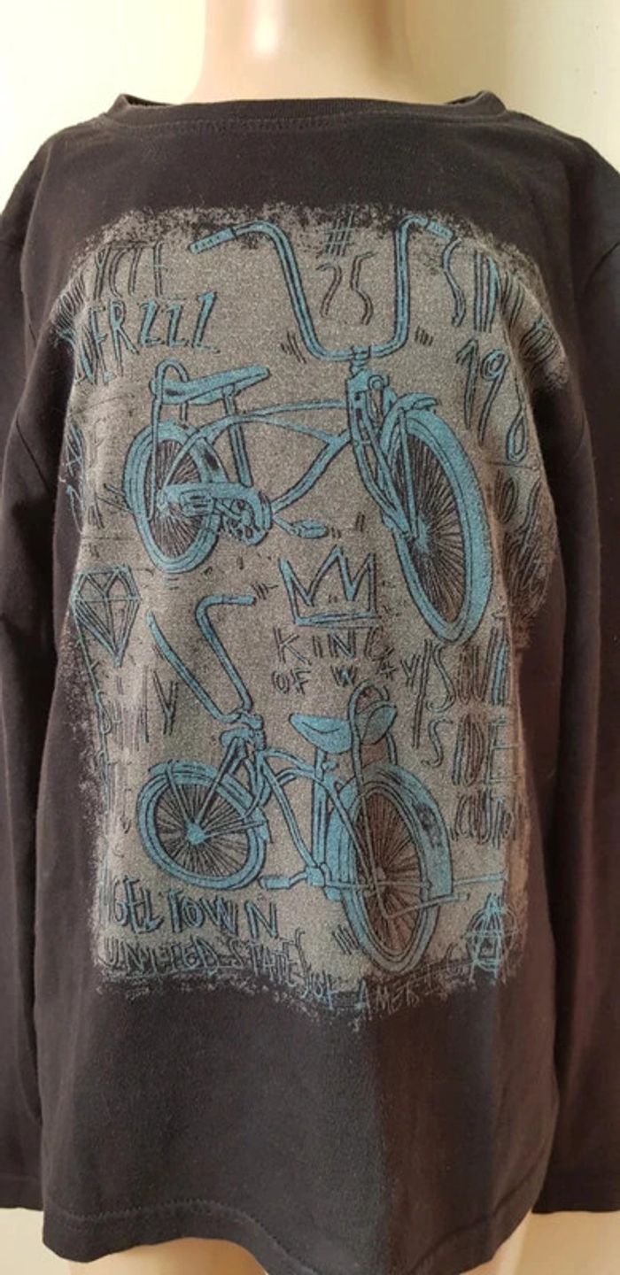 Tee-shirt manches longues noir, impression style délavé de vélos 🚲 - T. 8 ans - TRÈS BON ÉTAT. #alupineteeshirtgarcontaille8ans #teeshirtgarcon8ans #teeshirtmancheslonguesgarcon8ans #teeshirtmancheslongueskiabigarcon8ans #kiabigarcon8ans #teeshirtvelogarconkiabi8ans #kiabi