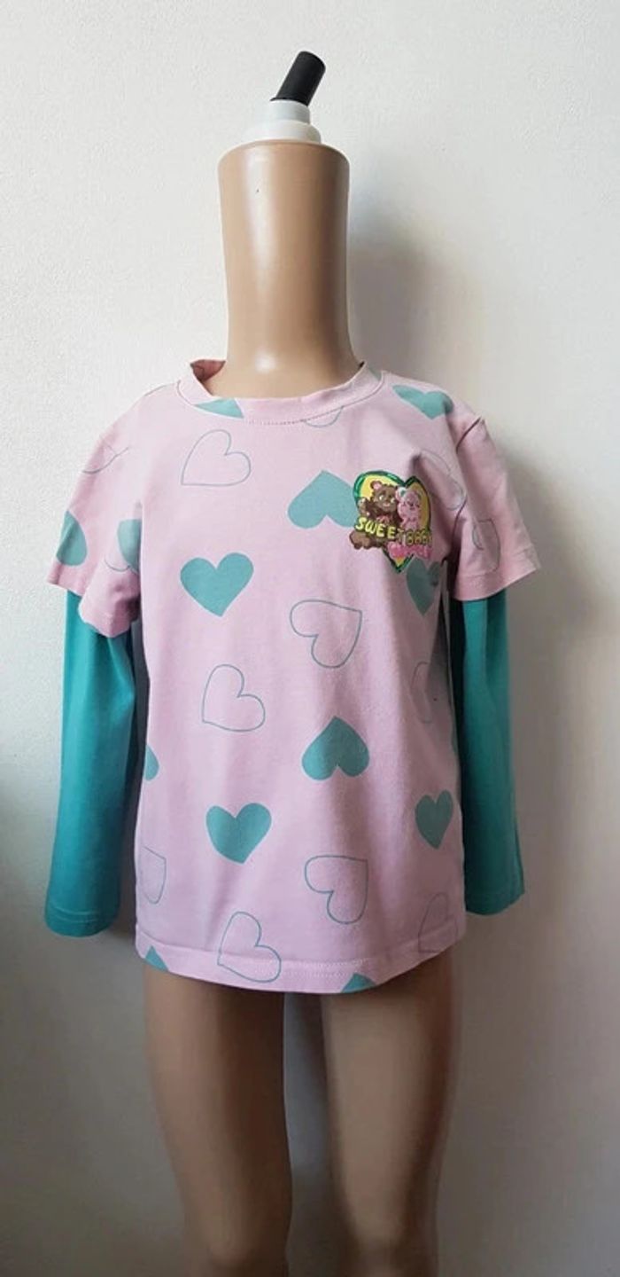 Tee-shirt rose effet 2 en 1 aux manches longues vertes, flocage coeur avec nounours - T. 4 ans - 1 tâche pas bien visible au niveau du col mais sinon reste en TRÈS BON ÉTAT. #alupineteeshirtfilletaille4ans #teeshirtfille4ans #teeshirtmancheslonguesfille4ans #teeshirtikgirlfille4ans #ikgirlfille4ans #ikgirl