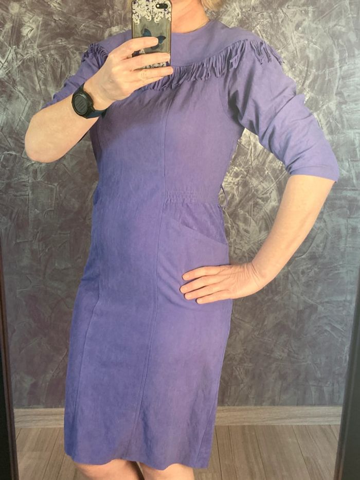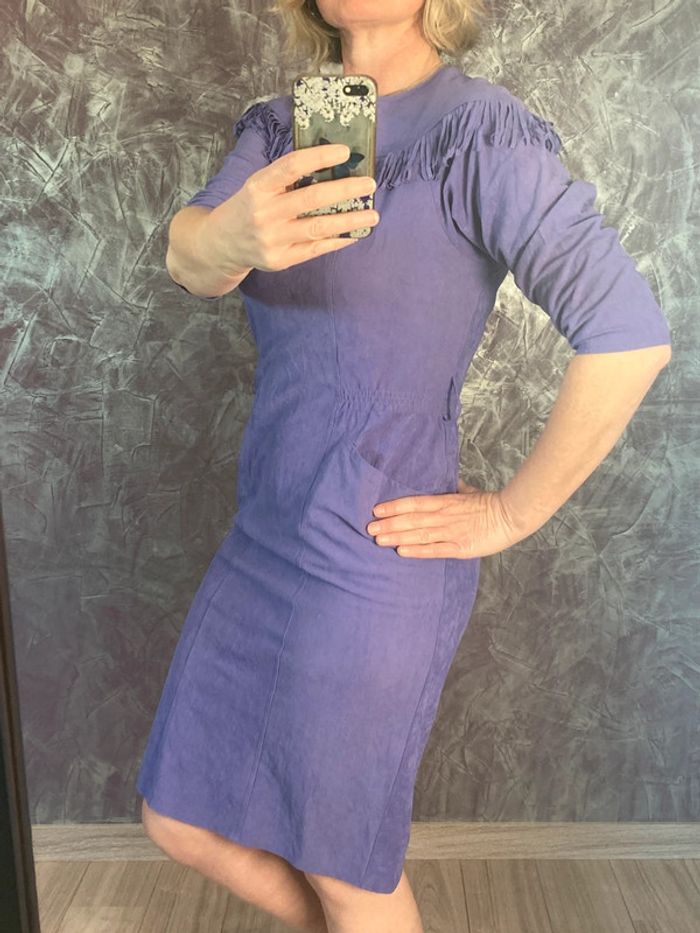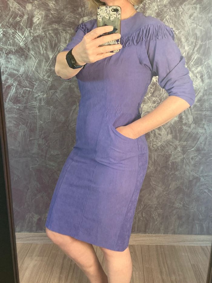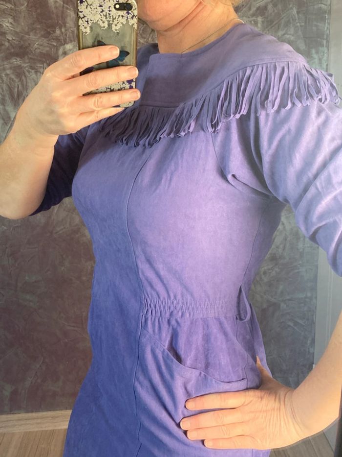 📌 Détail : Coupe droite, col rond, franges sur l’avant, longueur genou