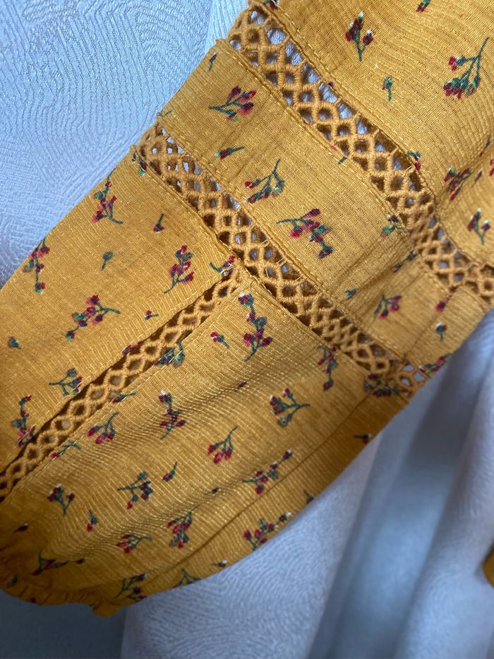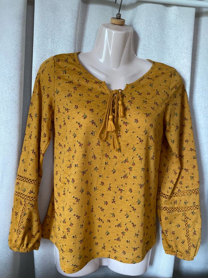 Jolie tunique jaune moutarde fleurie Manches longues Laçage à l'encolure Broderie sur le bas des manches Taille XS Plus d'étiquette de composition Creeks Carrure 32,5 cm Aisselle à aisselle 43 cm Longueur dessous de manche 46 cm Longueur 56,5 cm
