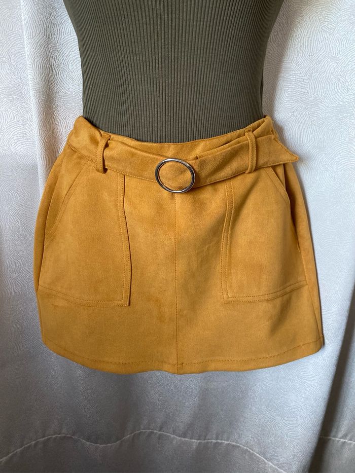 Jolie jupe parfait état suédine moutarde Taille S Bershka La ceinture mesure à plat sans tirer 31 cm, va jusqu'à 39 cm en tirant Longueur milieu devant 35,5 cm, milieu dos 37,5 cm