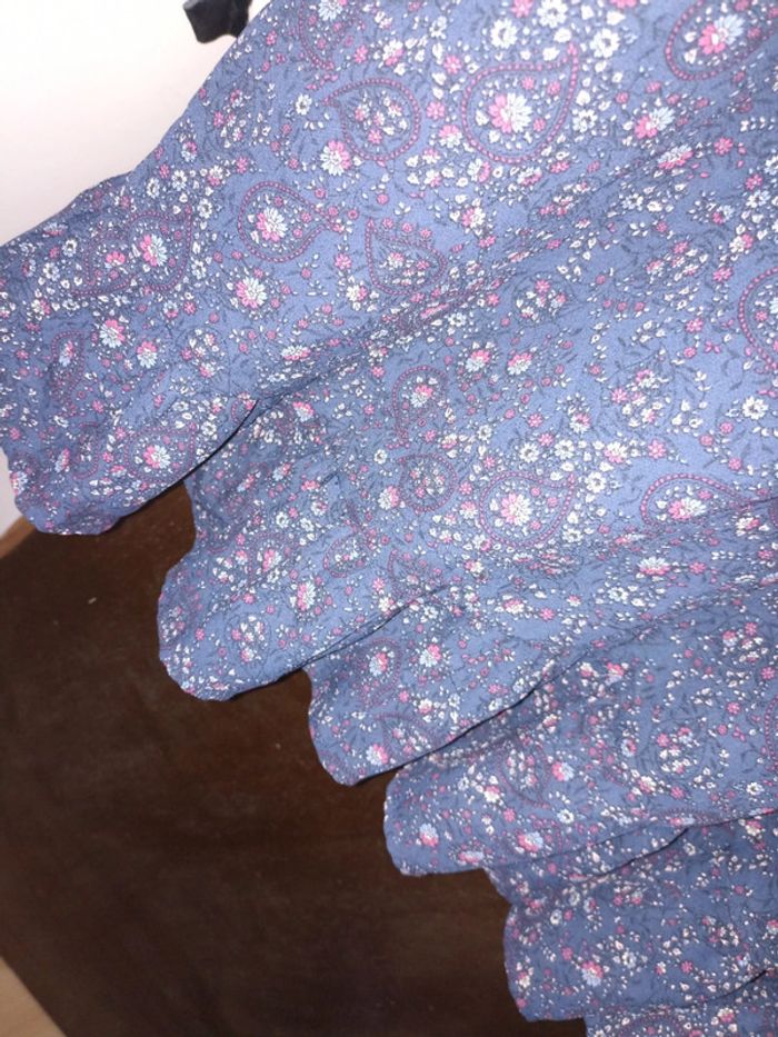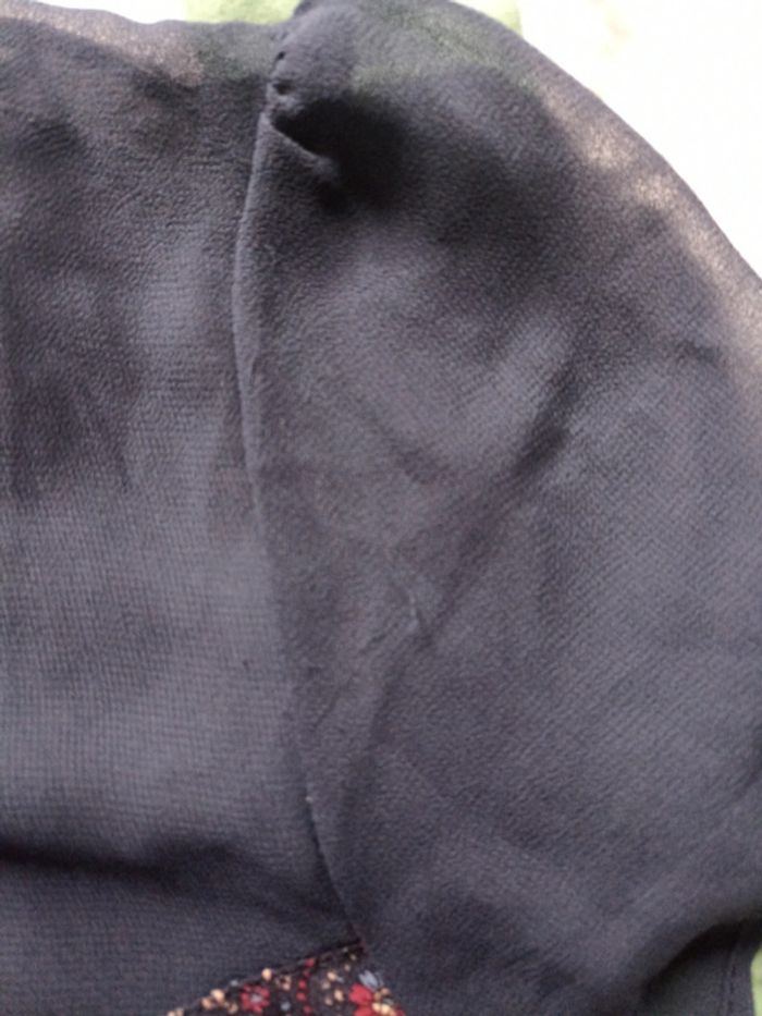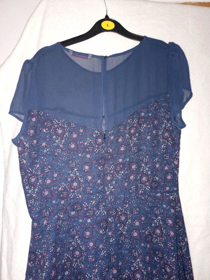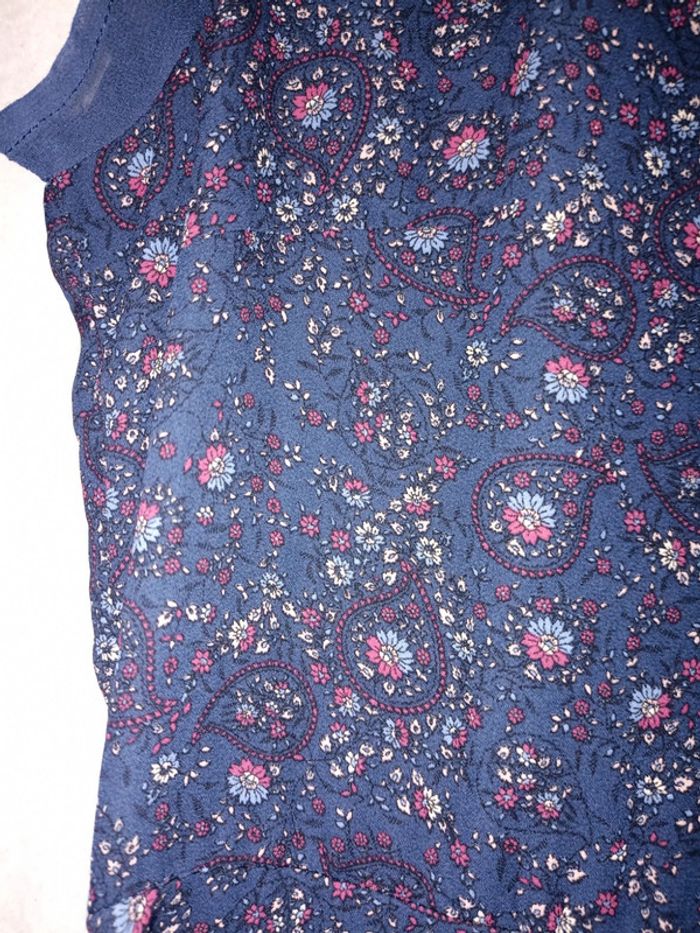 Robe bleu marine avec effet voilage sur le haut et en dessous imprimé fleuri Se ferme par un bouton et fermeture éclair ds le dos Un fil tiré sur une manche (se voit très peu) Taille un peu petit de mon avis personnel #mlledrey52femme