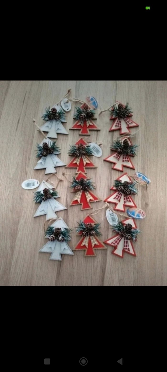 Lot de 12 décorations de sapin en bois. Neuves avec étiquettes
