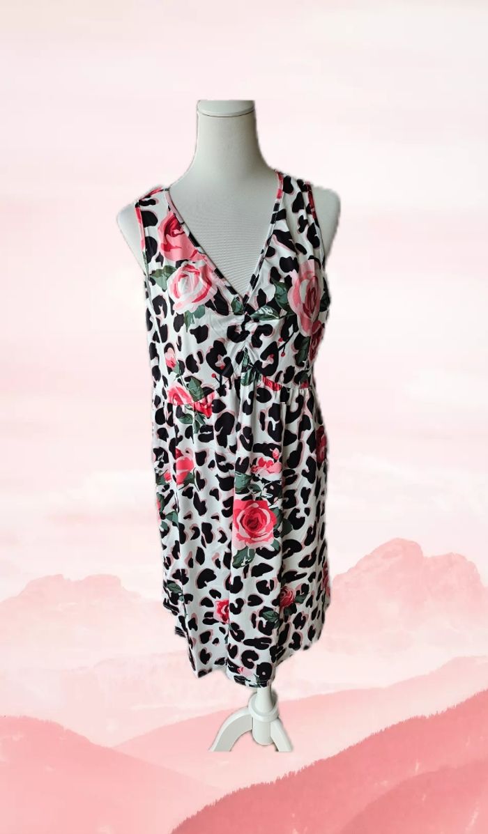 Robe imprimée léopard fleurie Sans marque Taille 1 XL (48) Très bon état ( portee 1 fois) 95% polyester/5% elastane Aisselles à Aisselles : 52 cm Hanches: 62 cm Longueur: 95 cm