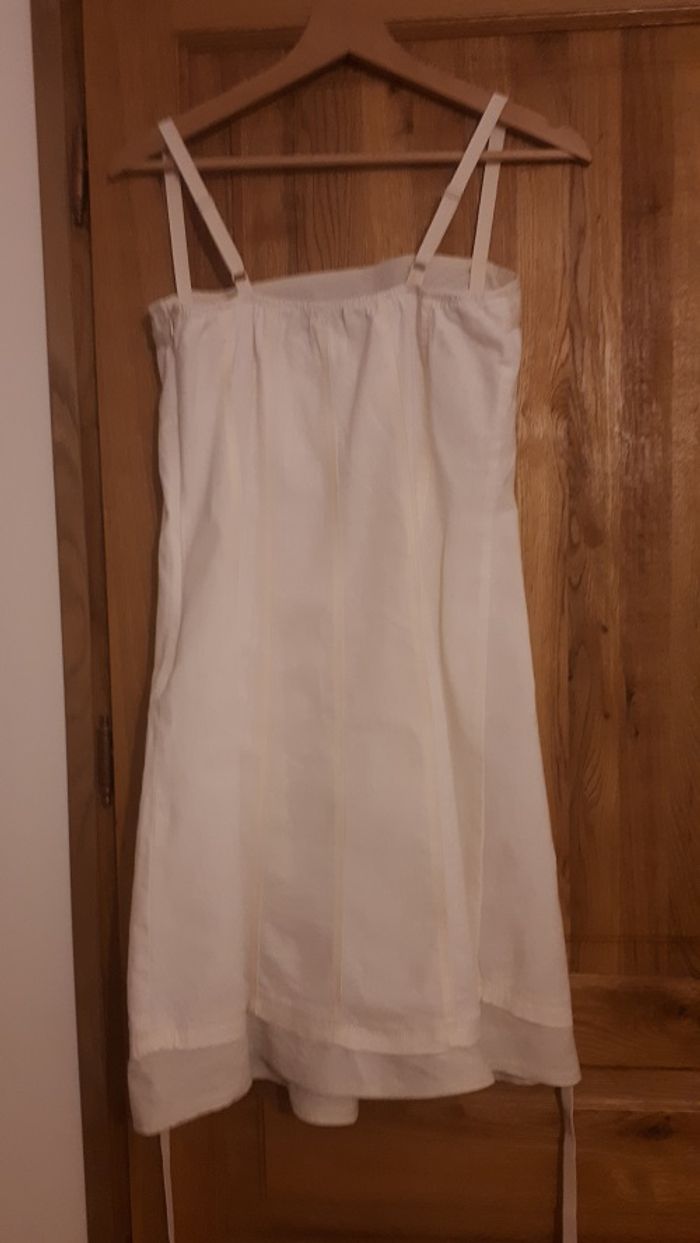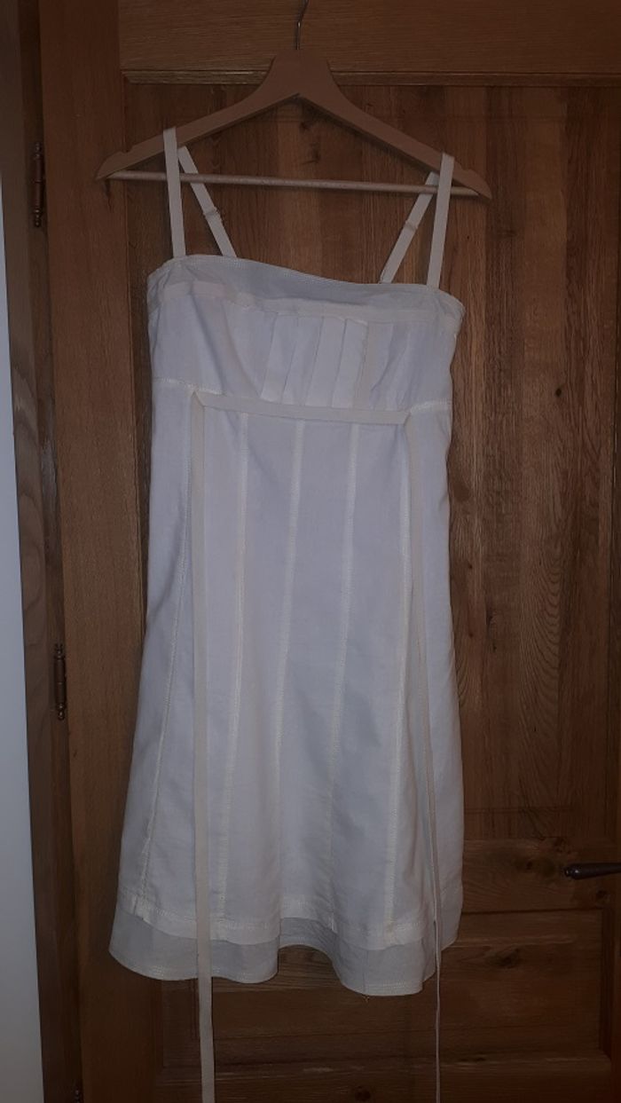 robe très bon état marque Griffelin taille M couleur blanc cassé. 45% coton 55% lin. fermeture par zip sur le côté et lien à attacher dans le dos..Longueur sans bretelle 77 cm. Bretelles réglables.