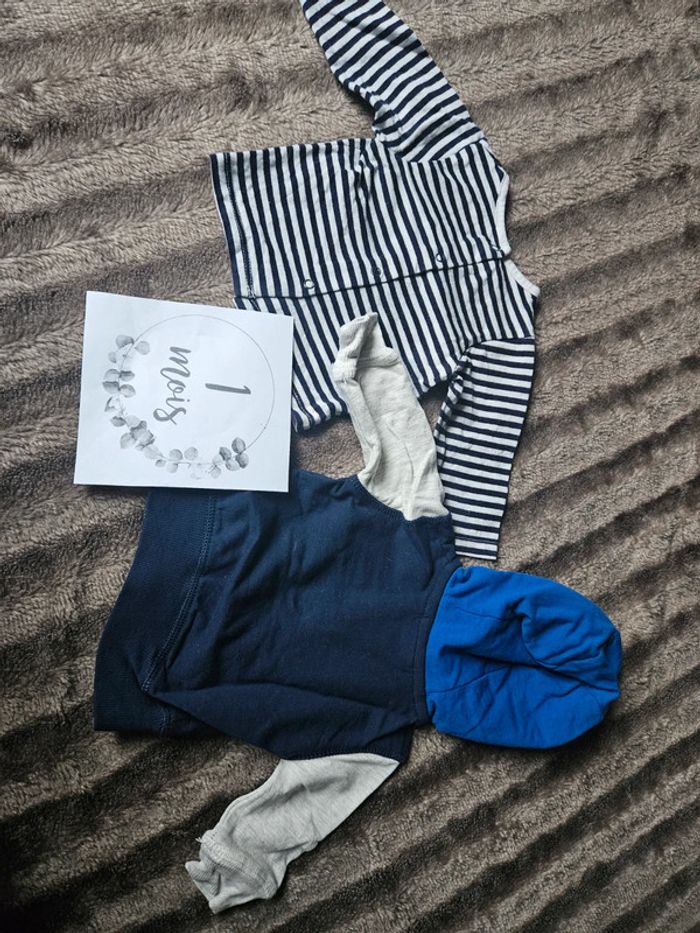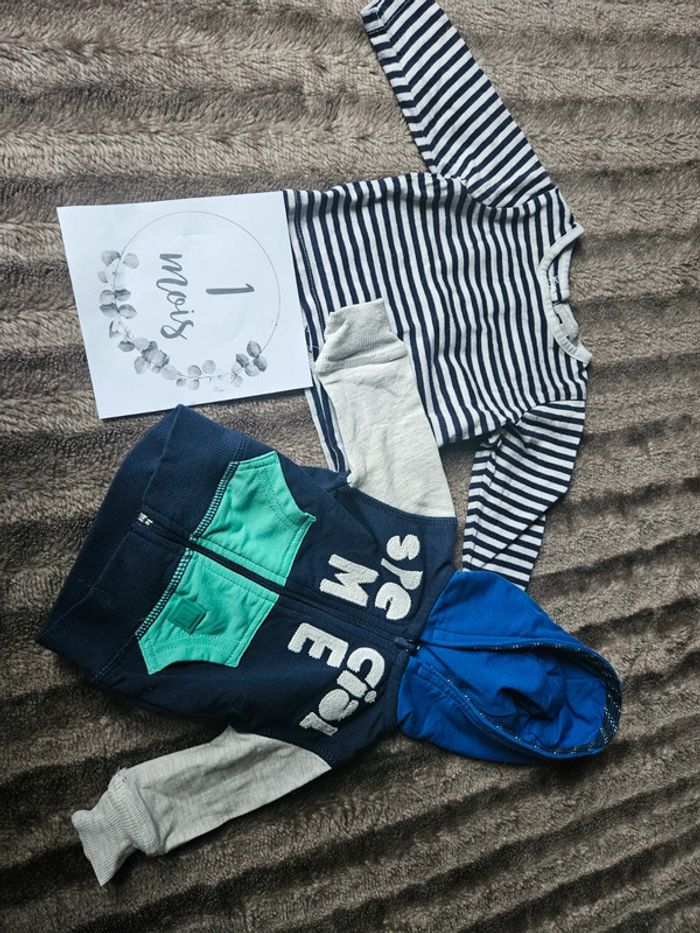 - 1 haut manches longues à rayures marque grain de blé - 1 gilet avec fermeture éclaire et capuche marque MEXX