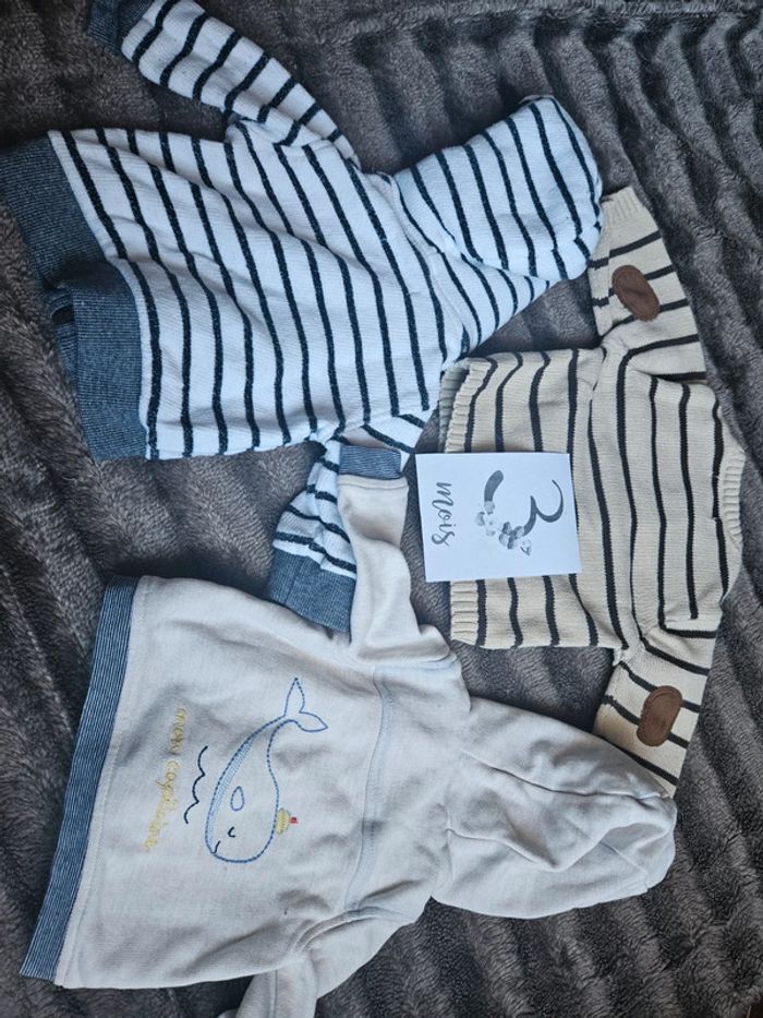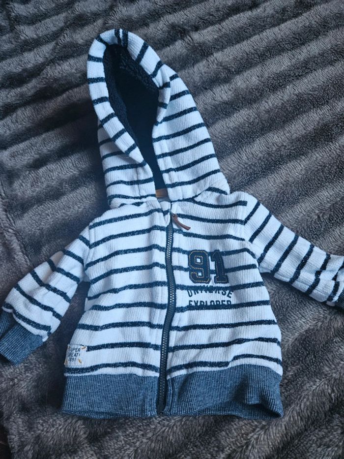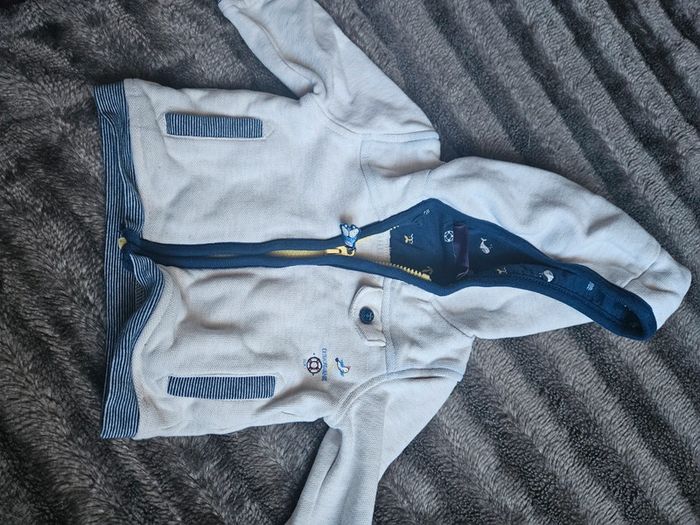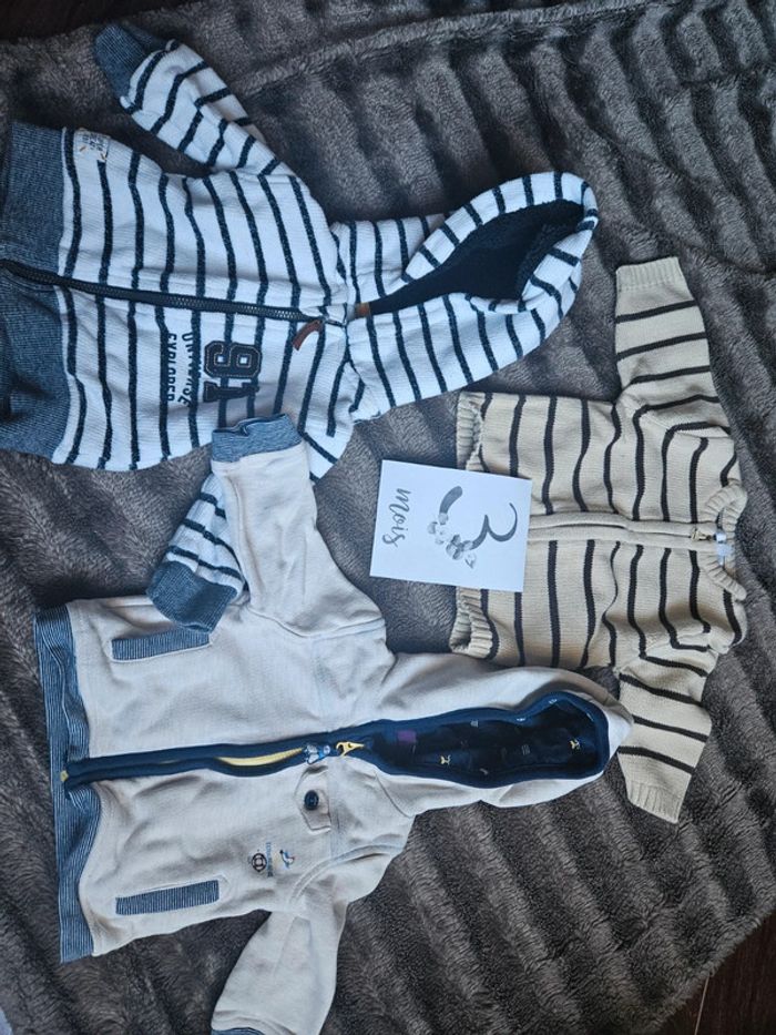 Lot comprenant : - 1 gilet rayures blanc et bleu marque Gemo baby avec fermeture éclaire et peluche polaire - 1 gilet rayures beige et gris avec fermeture éclaire marque Kitchou - 1 gilet beige avec fermeture éclaire marque sergent major Peu Portés