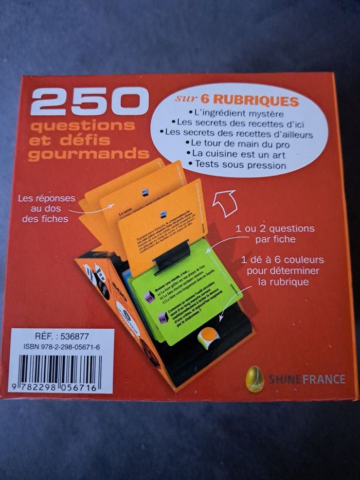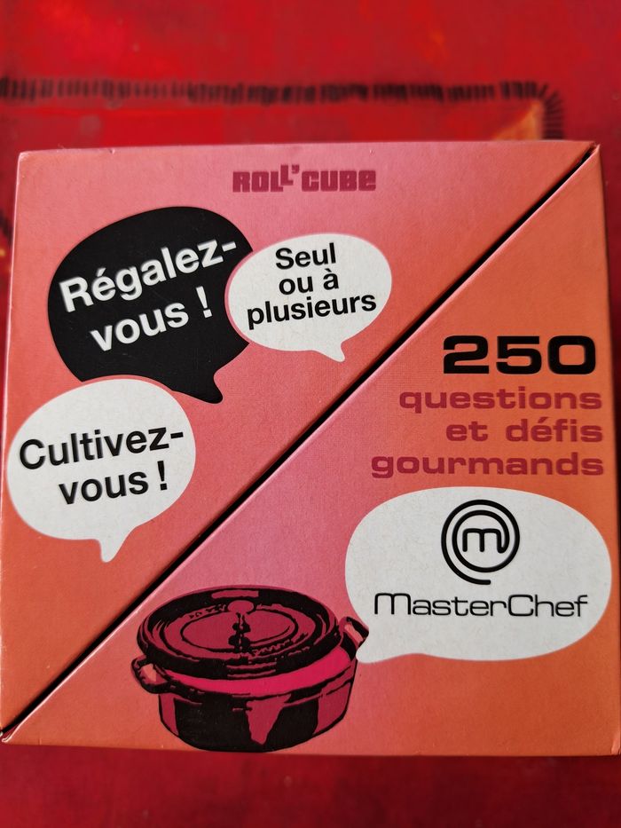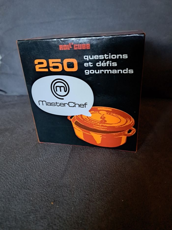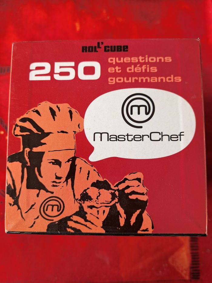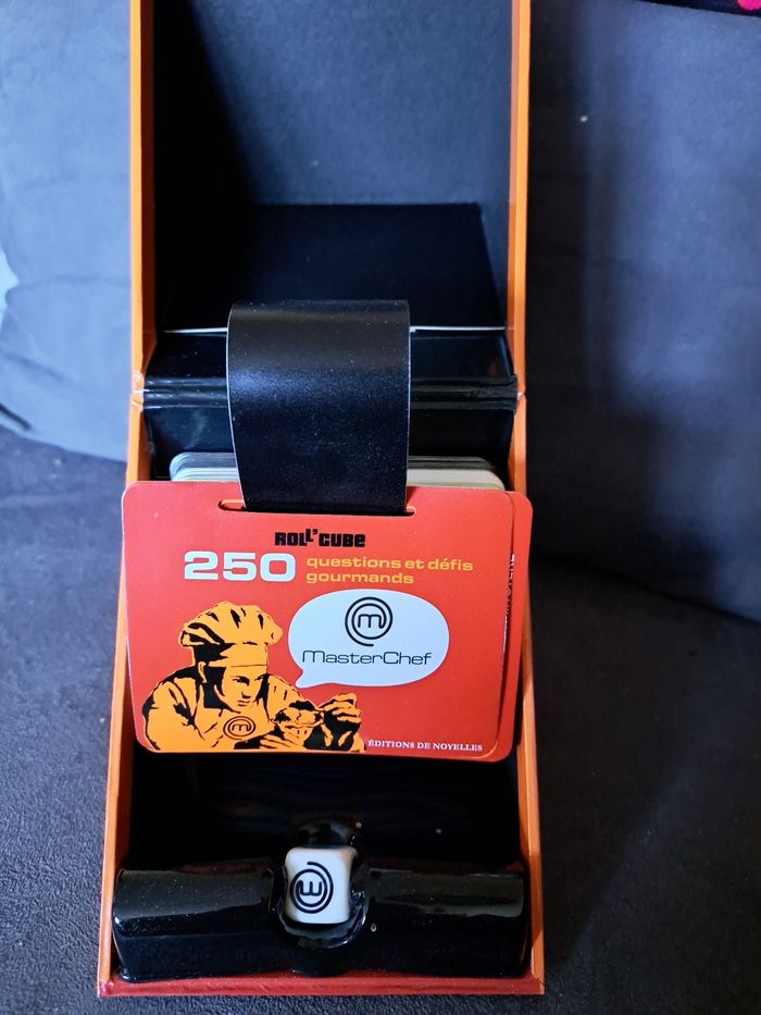 Le ROLL'CUBE est une collection de cubes qui se décline sur plusieurs thèmes : ici, un Roll'Cube aux couleurs de l'émission MasterChef, qui allie cuisine et divertissement pour tester vos connaissances et vos aptitudes dans le domaine de la cuisine. 250 questions et défis pour vous mesurer à vos adversaires, répartis en six thèmes : - L'ingrédient mystère : pour deviner à partir d'indices l'ingrédient dont on parle ; - Les secrets des recettes d'ici et Les secrets des recettes d'ailleurs : pour tester vos connaissances de la cuisine française et du monde ; - Le tour de main du pro : pour mettre à l'épreuve votre maîtrise des techniques de Chef ; - La cuisine est un art : connaissez-vous sur le bout des doigts les grands Chefs, les restaurants d'exception, ainsi que leur représentation dans les arts ? C'est le moment de le prouver ! - Tests sous pression : mimez des mots ou répondez aux questions en un temps chronométré, et prouvez que vous n'avez pas peur des défis ! Le dé coloré contenu dans ce Roll'Cube choisira au hasard la rubrique du défi que vous devrez relever : tenez-vous prêt, remportez les challenges et montrez aux autres joueurs que le cordon bleu, c'est vous ! Bref, régalez-vous !