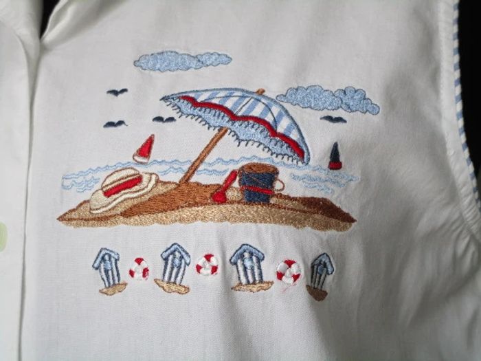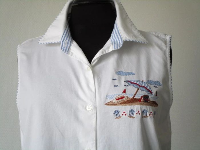 Chemise blanche sans manches vintage Taille 2, correspond à du 38 (cf mesures) Broderies thème plage côté gauche de la poitrine Fin liseré rayé blanc et bleu ciel autour du col et des emmanchures 100% coton Largeur aisselle à aisselle : 49 cm Longueur : 68 cm Etat impeccable #mamanbrade59femme38