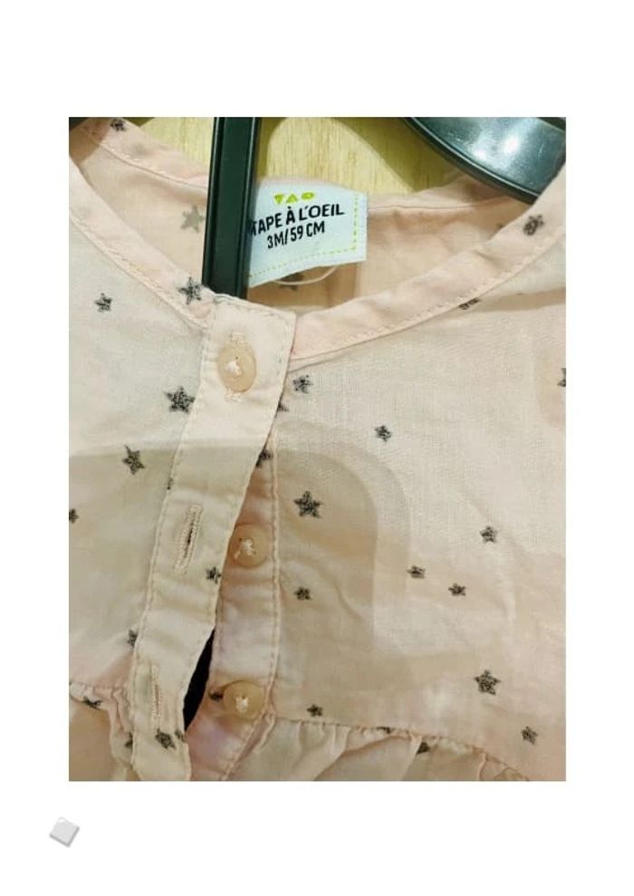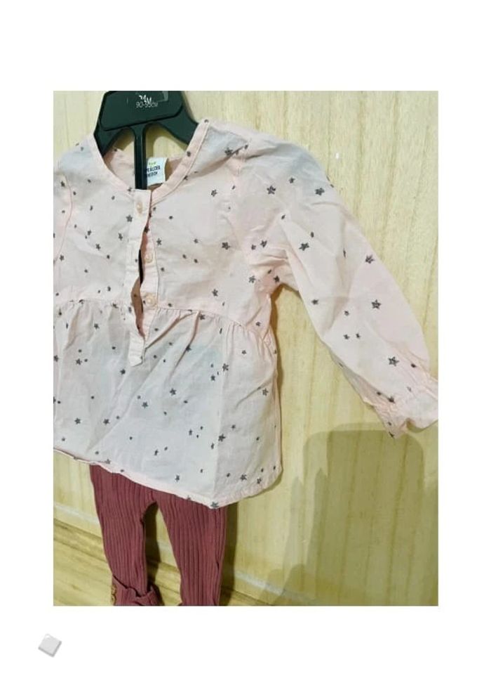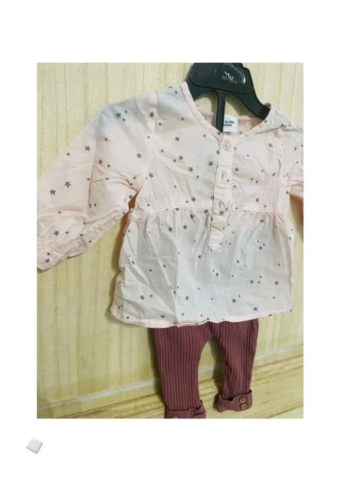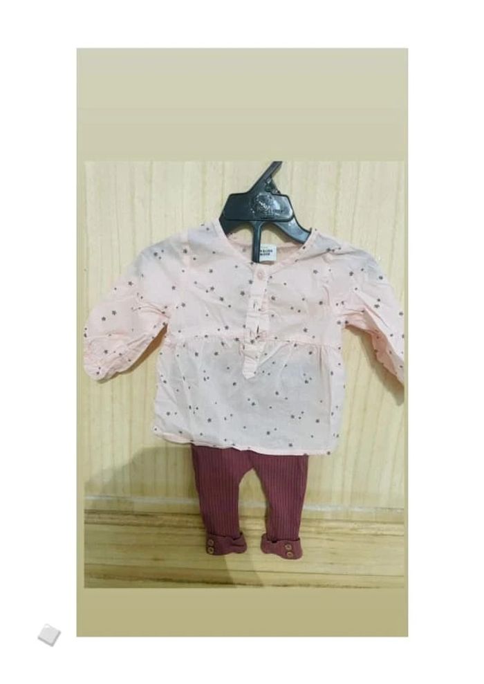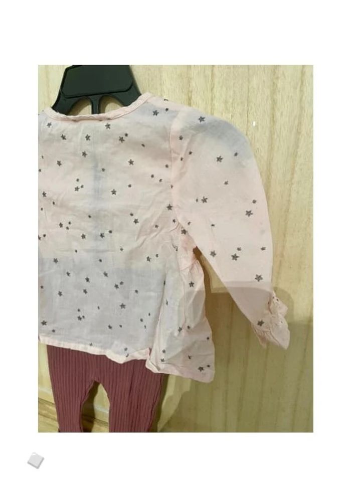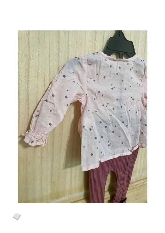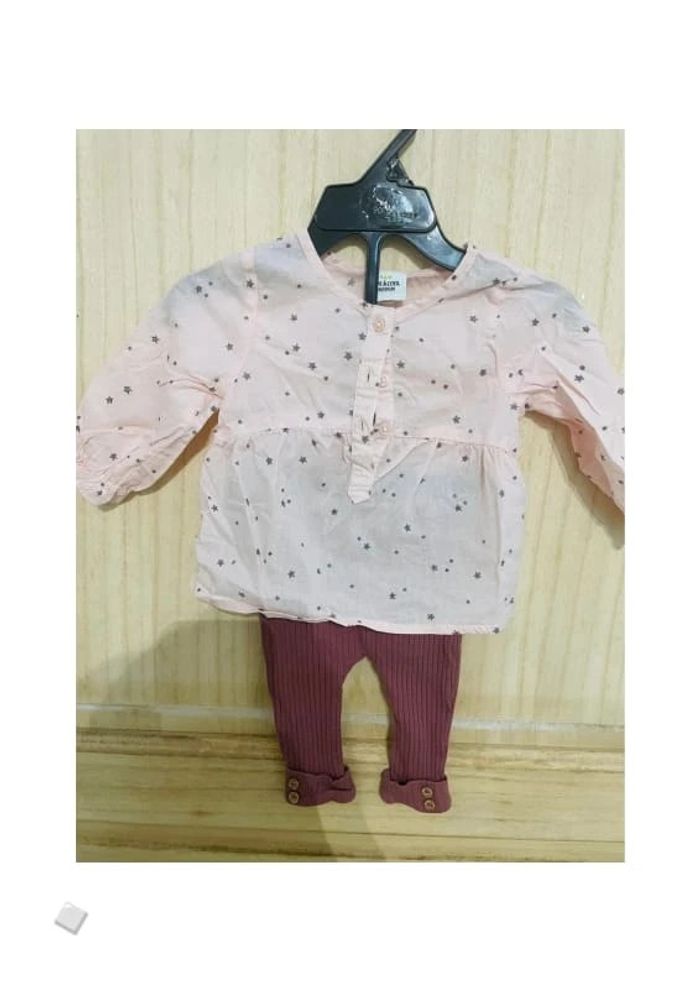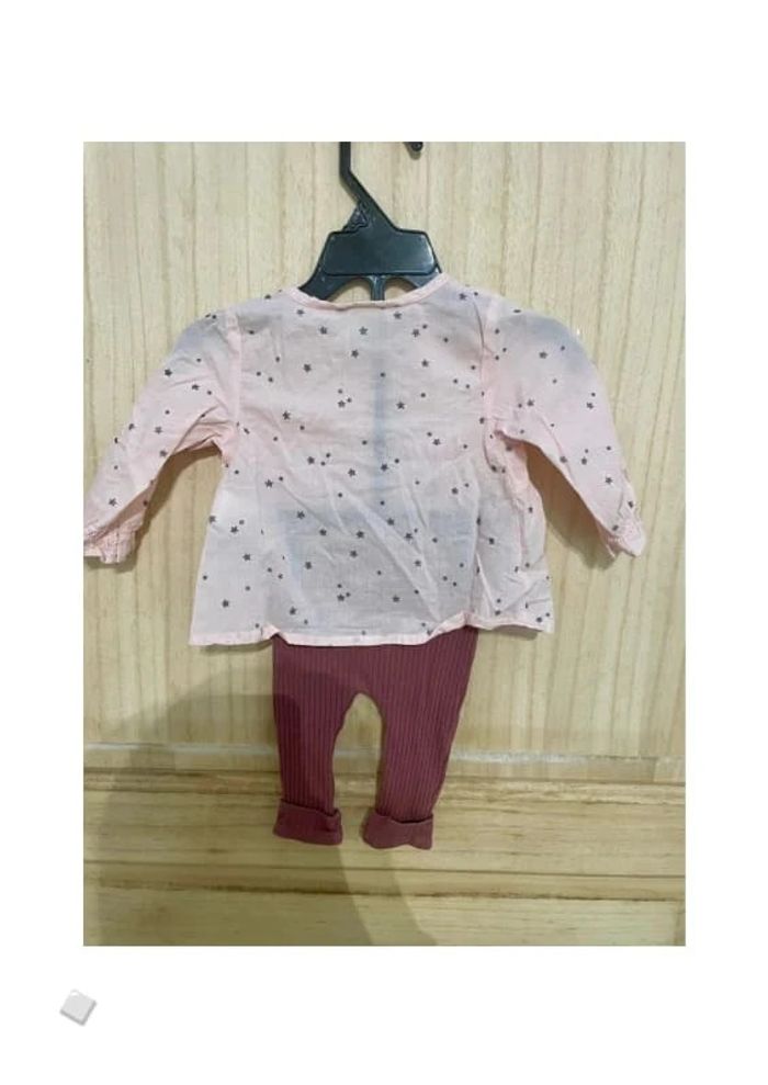 Ce n’est pas un ensemble à la base - haut très léger manches longues rose pale, motif étoiles argentés, petits boutons à l’avant Marque : tape à l’œil - leggings couleur vieux rose, revert sur le bas De marque : kiabi #jennyspearsbebefille3mois