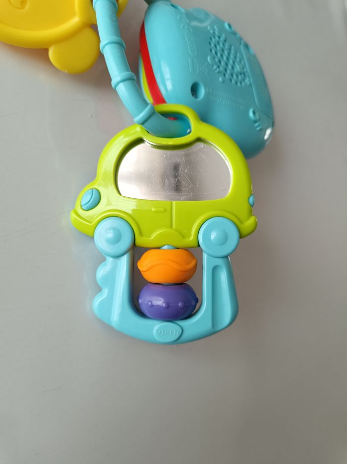 Porte clefs interactif. Parle et chante. Contient : boutons colorés, miroir, rouleau, petites billes, clé de dentition. Fonctionne avec piles. Âge : de 3 mois à 36 mois. #melody45340jeux