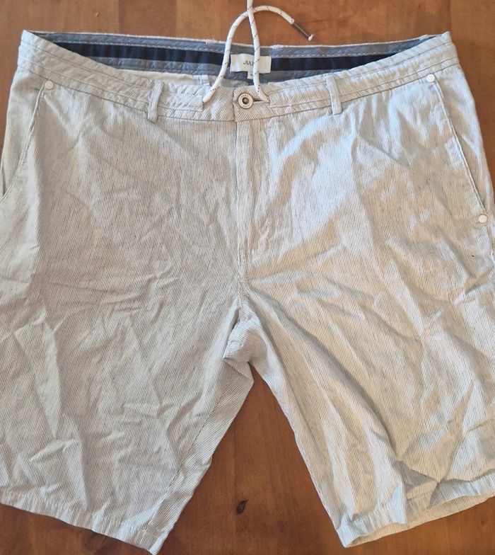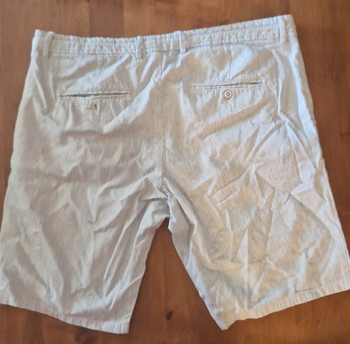 Joli bermuda, fines rayures bleu/blanc, taille 48, cordon et passants ceinture, très peu porté, envoi rapide #bermuda #homme #taille48 #cordonceinture #passantsceinture #rayuresverticales #rayuresbleuesetblanches #envoirapide