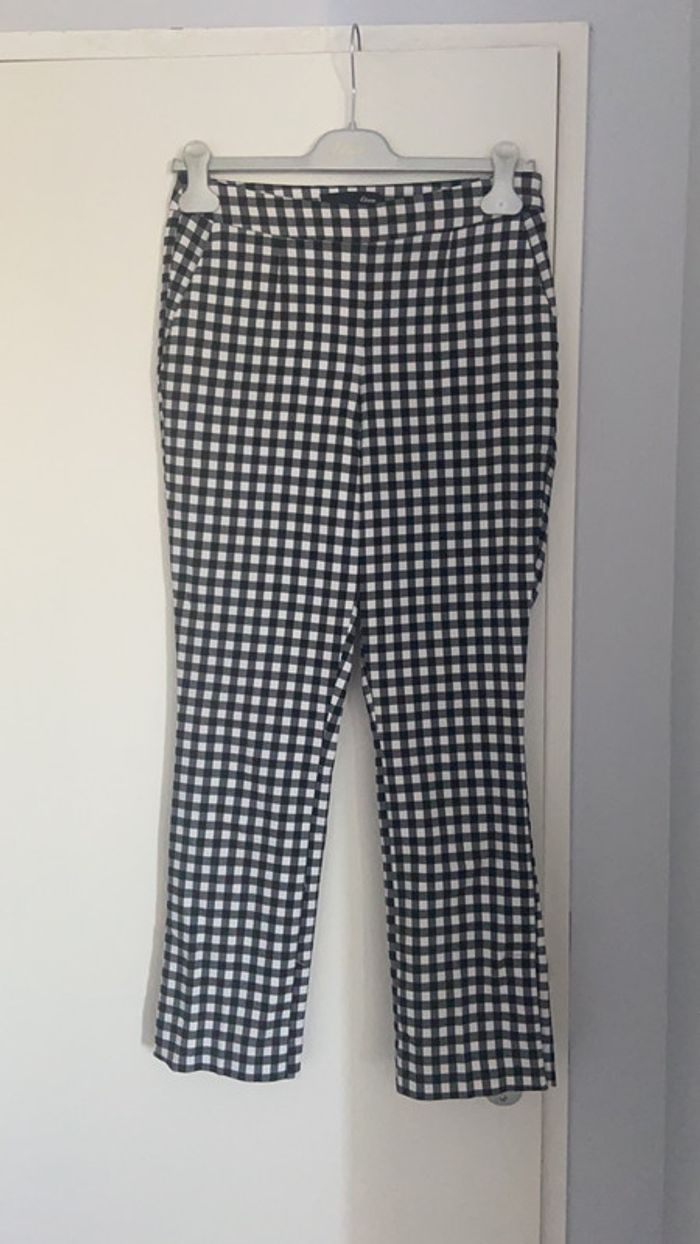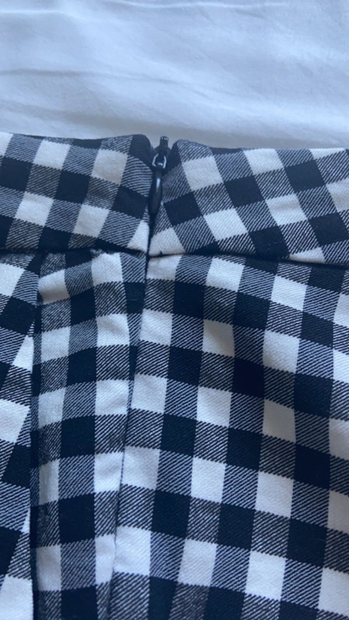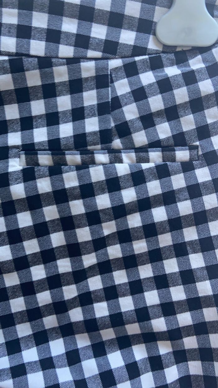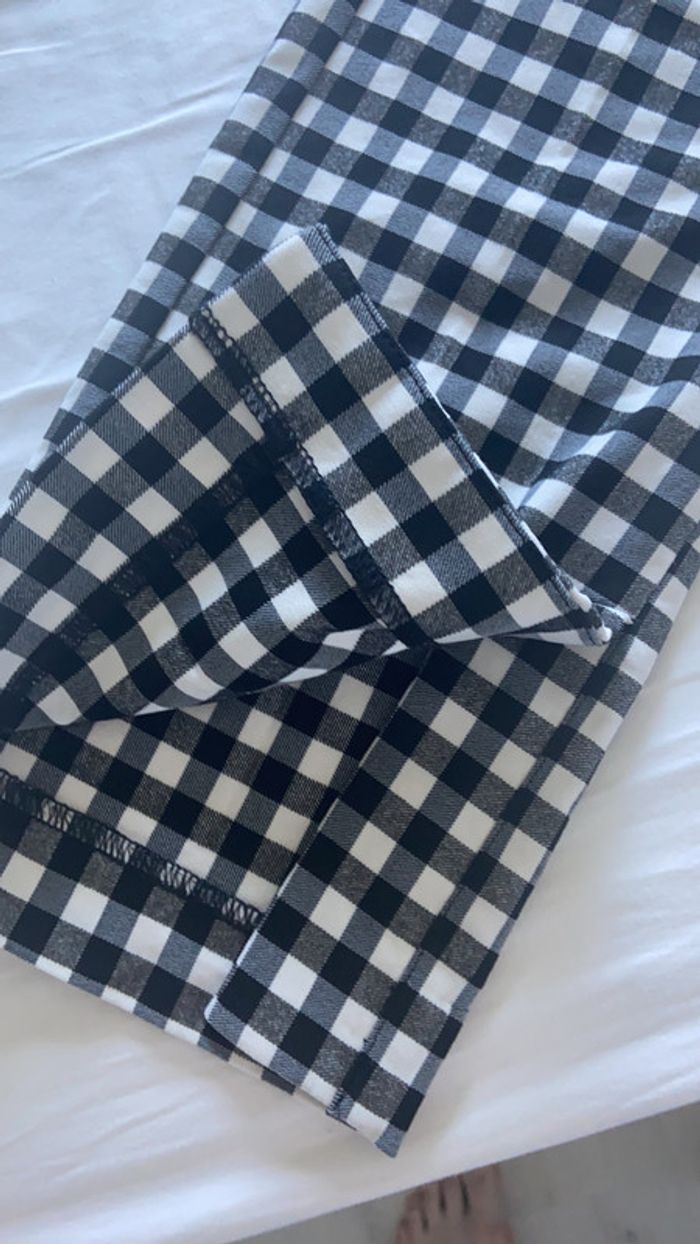 Pantalon à carreaux vichy, jamais porté. Il est ouvert au niveau des chevilles et il se ferme a l’aide d’une fermeture éclair sur le côté du pantalon. La matière est très agréable à porter.
