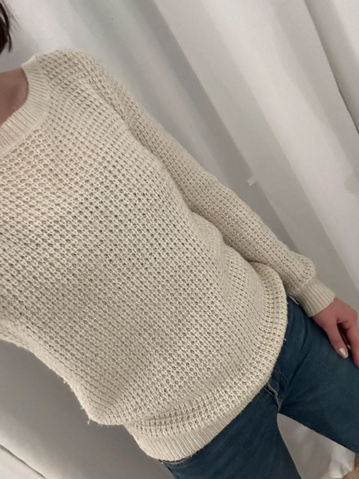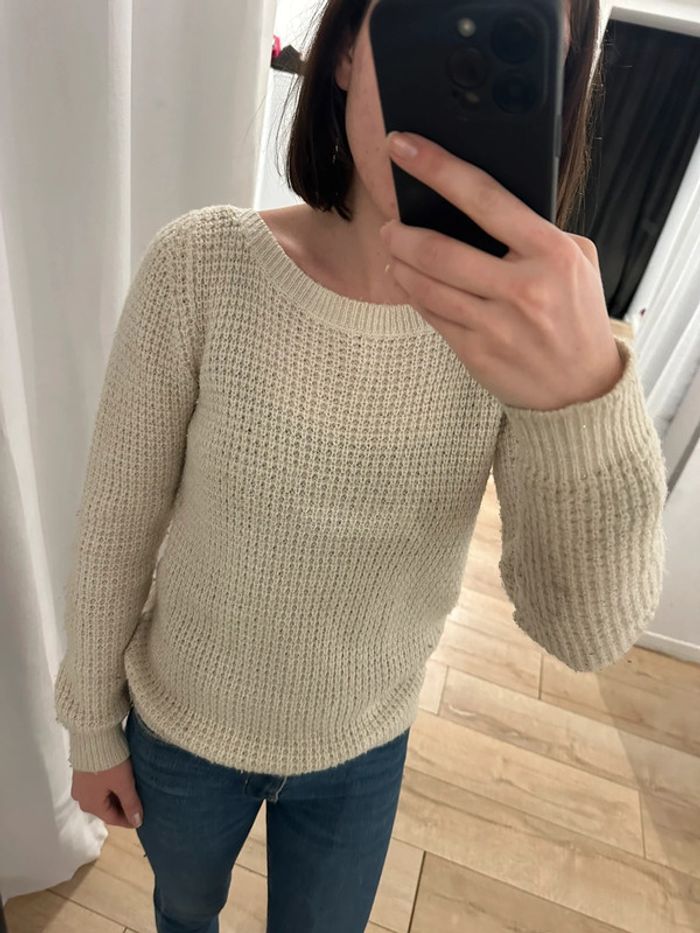 Pull en maille blanc cassé / crème Cache cache Col rond avec petite fermeture derrière Un peu boulocheé Je vends aussi en rouge faites un lot !