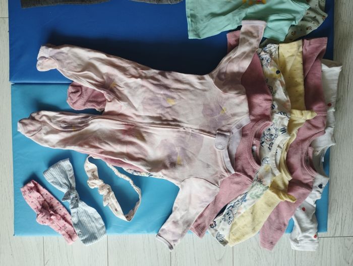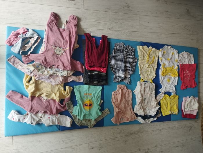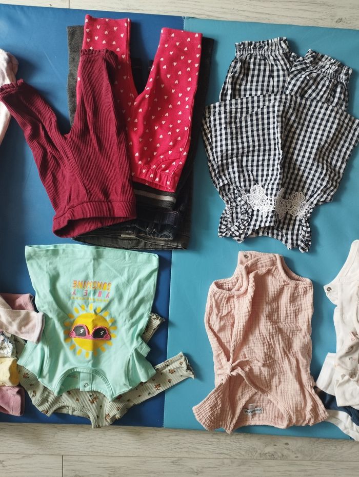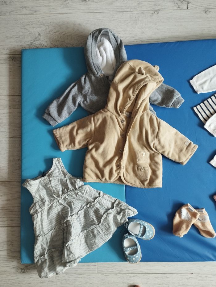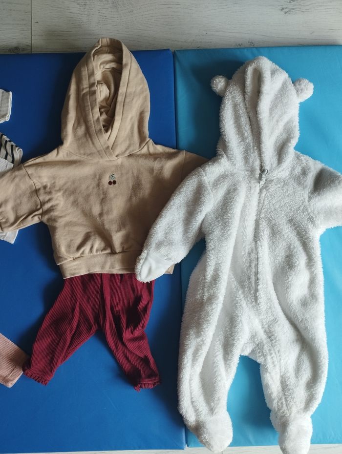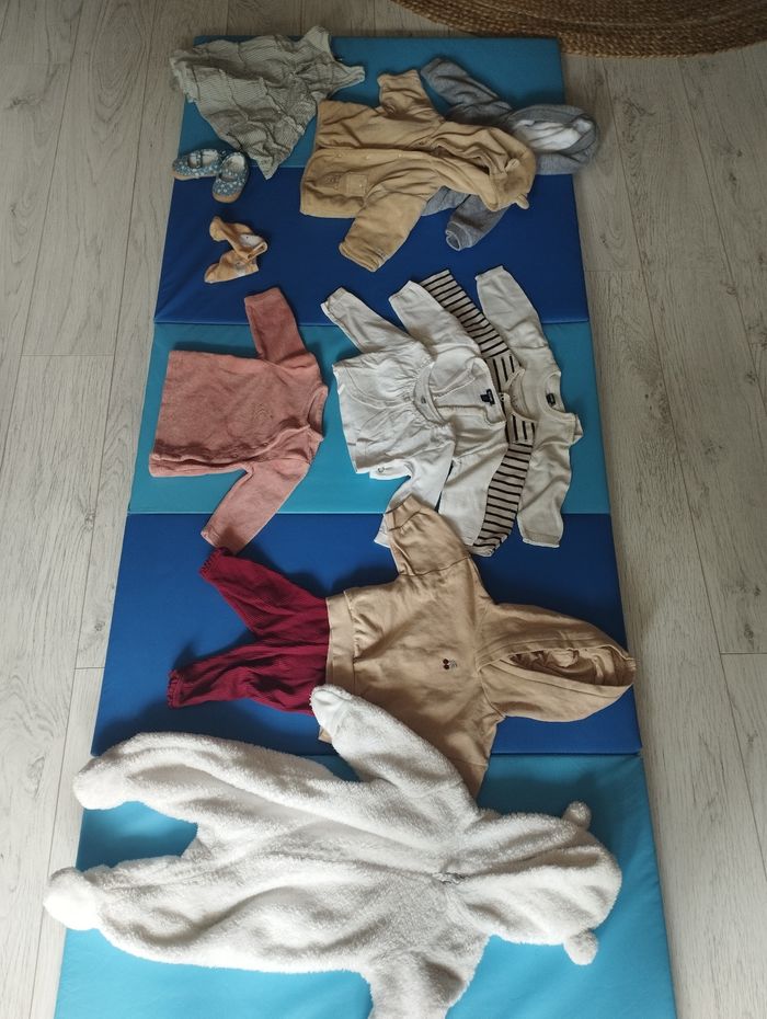 Lot 3 mois Plutôt mi saison Marque orchestra, Kiabi, tape à l'oeil, monoprix, H&M, etc.. 6 bodys dont 1 manches longues 4 culottes / shorts 6 pantalons / leggings 7 ensembles / robes / barboteuses 3 hauts légers style t-shirt 6 pyjamas dont 4 chauds et 2 + légers 8 pulls dont 3 sweat capuche, 2 gilets, 2 pulls classiques, 1 pull "nuit" 1 combinaison intégrale chaude nounours blanche 1 paire chaussures 1 paire chaussettes 3 bandeaux 1 bonnet marron (qui n'est pas sur la photo > je me suis trompée il est sur la photo du lot 6mois) Je privilégie vente par lot et remise en main propre sur Pessac, Mérignac ou Bordeaux vers Bacalan. J'ai aussi un lot naissance, un lot en 6M, et bientôt un lot en 9M.