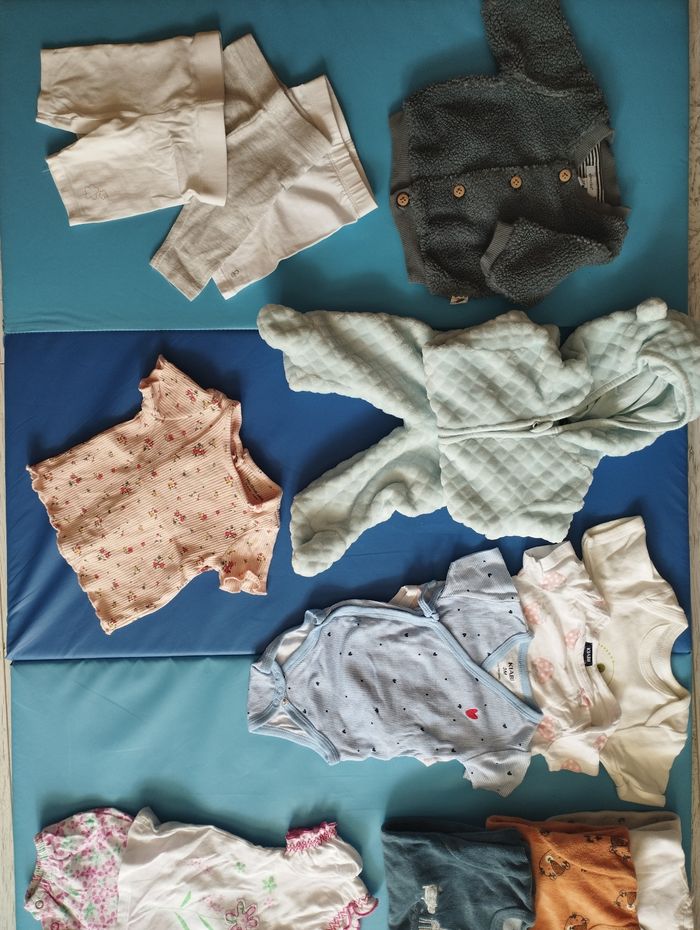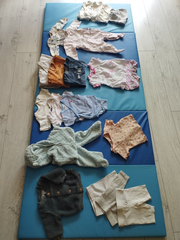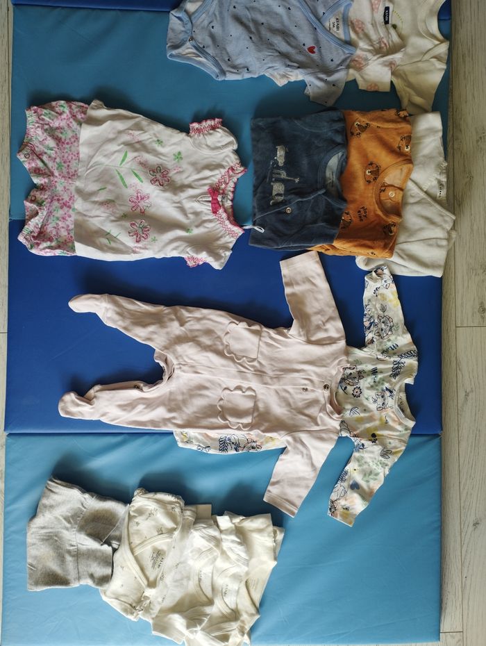 Lot 3 mois Plutôt mi saison Kiabi, orchestra, Jacadi, etc.. 1 pull 1 ensemble pull capuche pantalon doux 1 ensemble t-shirt short reliés 3 leggings 1 Tshirt 3 bodys 5 pyjamas dont 3 chauds et 2 plus légers En+ : Offerts si vous le souhaitez les 4 bodys blancs à droite et le legging gris car ils ont le col qui a jauni. Sinon je les sors du lot sans problème. J'ai également un second lot de 3 mois qui est + conséquent (45 vêtements). Je privilégie la vente par lot et remise en main propre sur Pessac, Mérignac et Bordeaux Bacalan. J'ai aussi des lots en naissance, 6M et bientôt en 9M.