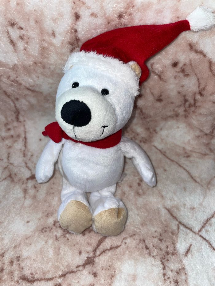 Peluche ours blanc polaire Porté une écharpe et un bonnet de Noël rouge +/- 23cm Kinder Ferrero Occasion en très bon état Vous achetez le doudou que vous voyez sur la photo