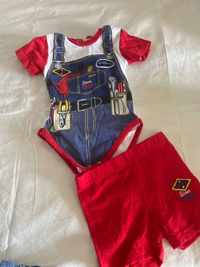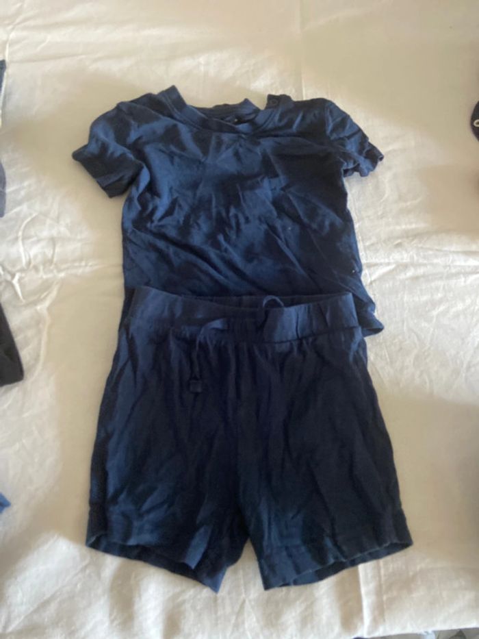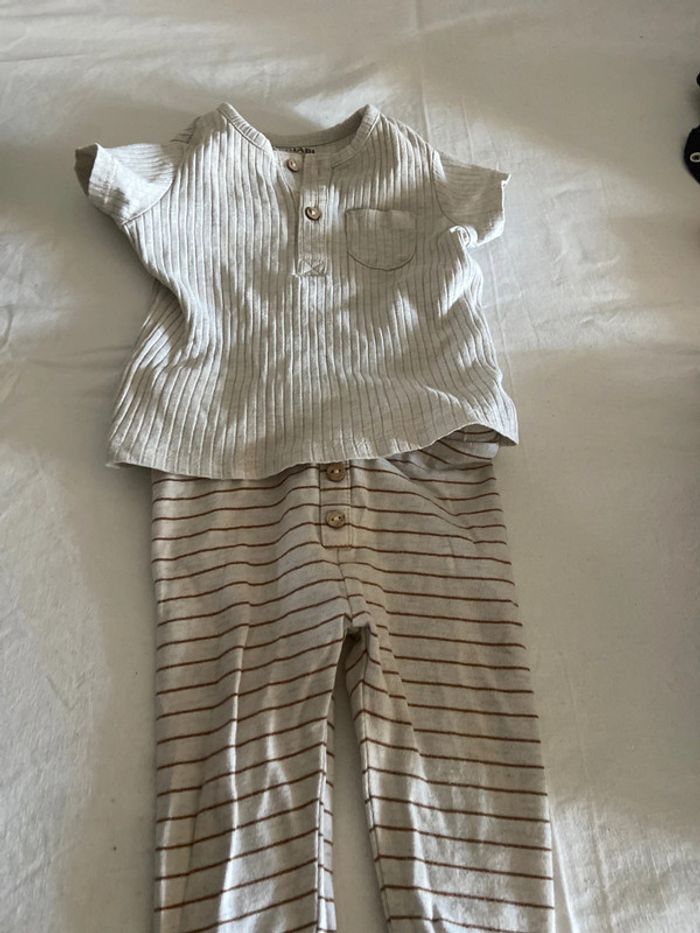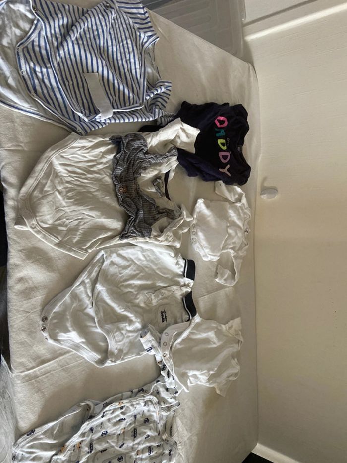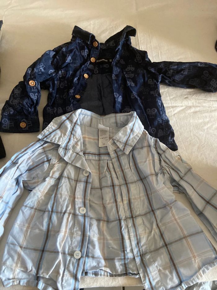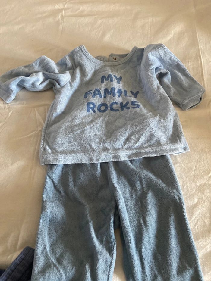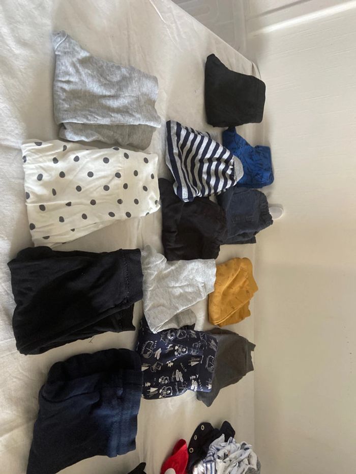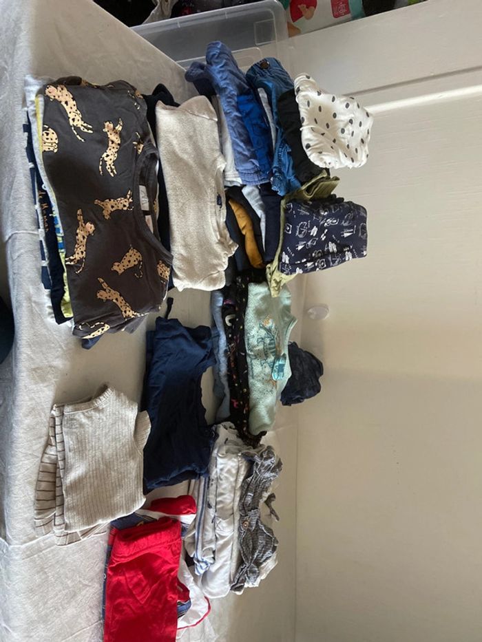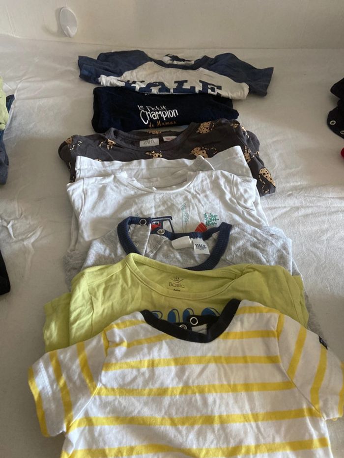 Compose de : -2 chemises -7 t-shirt -3 pyjamas -3 ensembles -3 sweat -7 bodies -13 pantalons -4 shorts. Majorité de 6 mois et quelques articles 6/9 mois. Diverses marques: Kiabi, primark, tex, h&m, Gemo, Zara. En bon état.