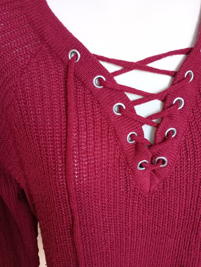 Pull bordeaux avec laçage à l'avant. Longueur : 80 cm Largeur entre aisselles : 55 cm Taille : 46 Marque : Zeeman Très bon état