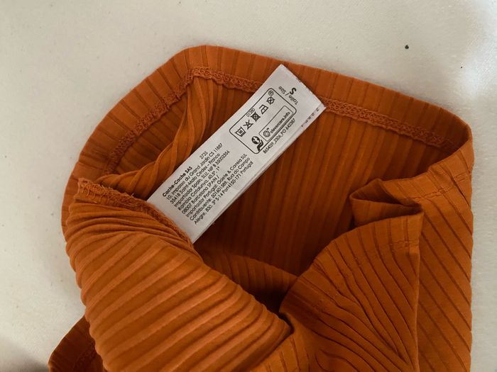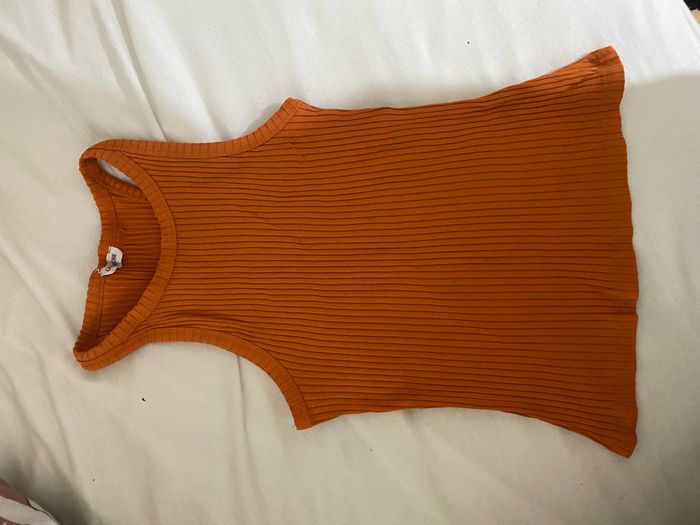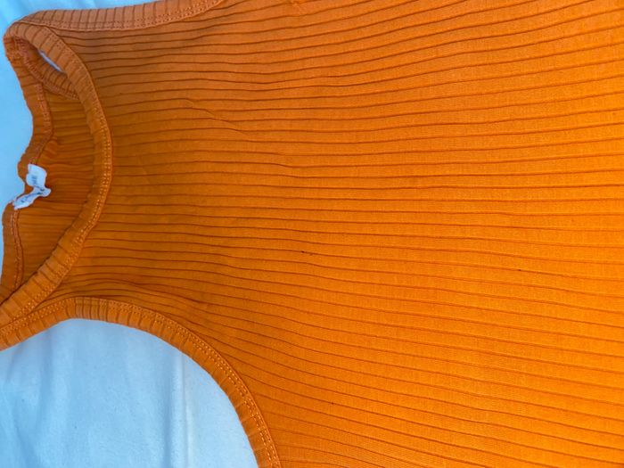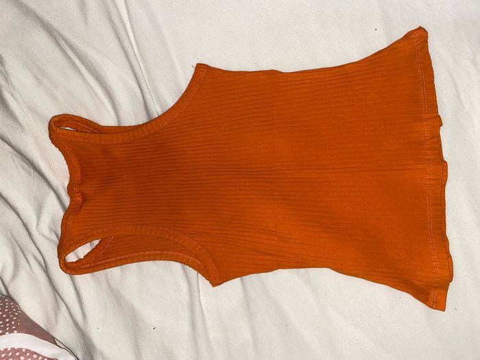 débardeur orange côtelé collé au corps taille s sur l’étiquette mais taille petit ( xxs )