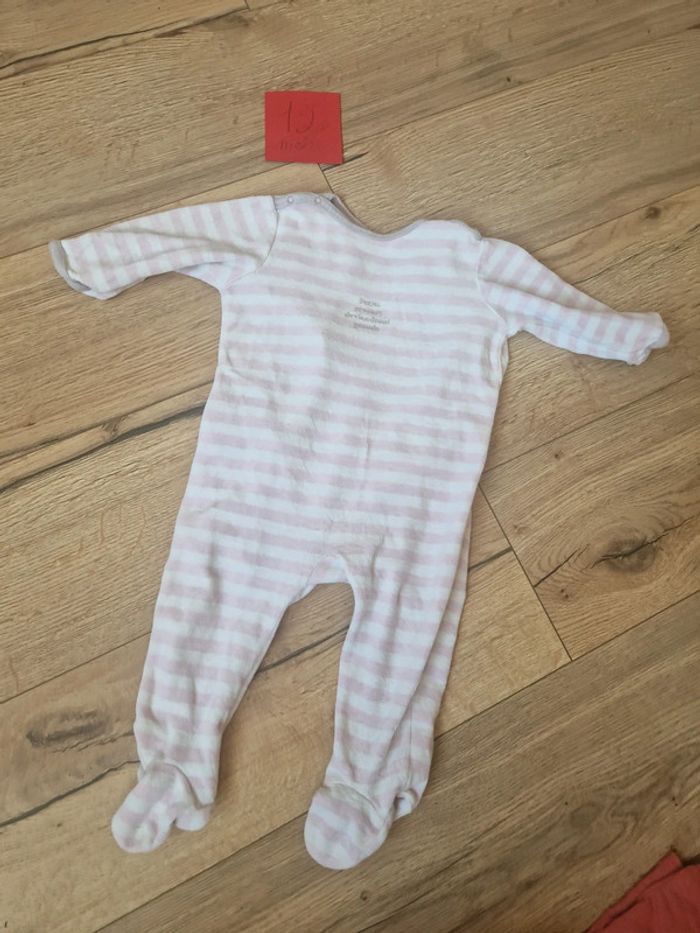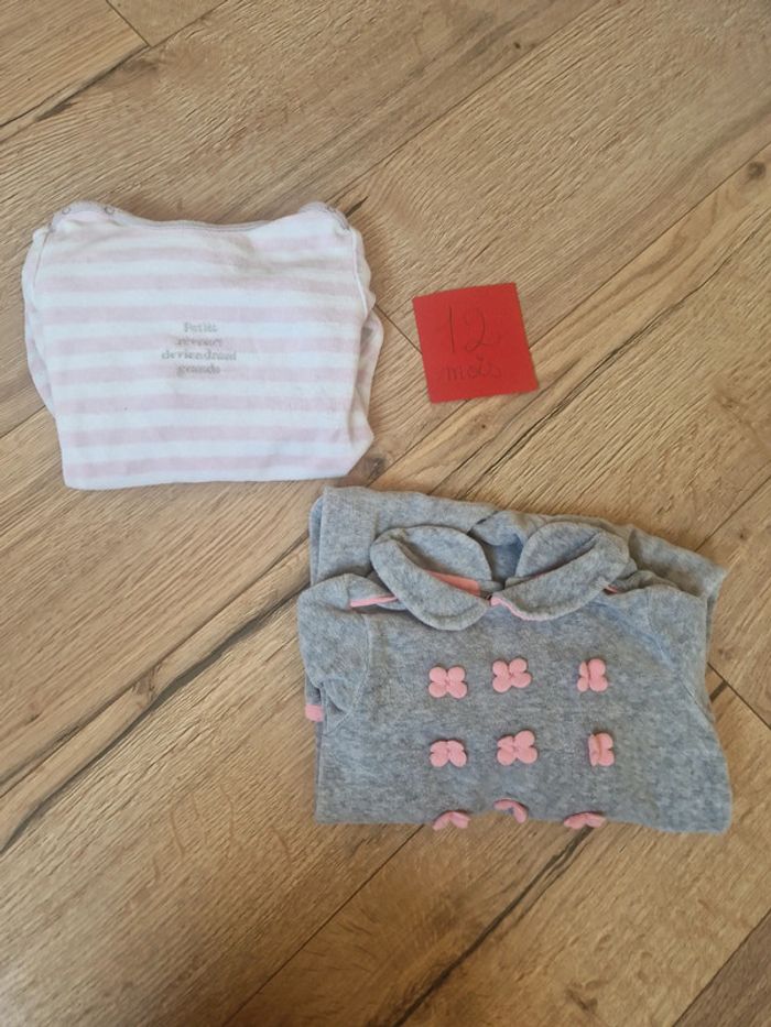 2 pyjama velours en excellent etat: -Gris: fleurs rose en reliefs, pied antidérapants, marque obaïbi -Rayé rose et blanc : marque bout'chou