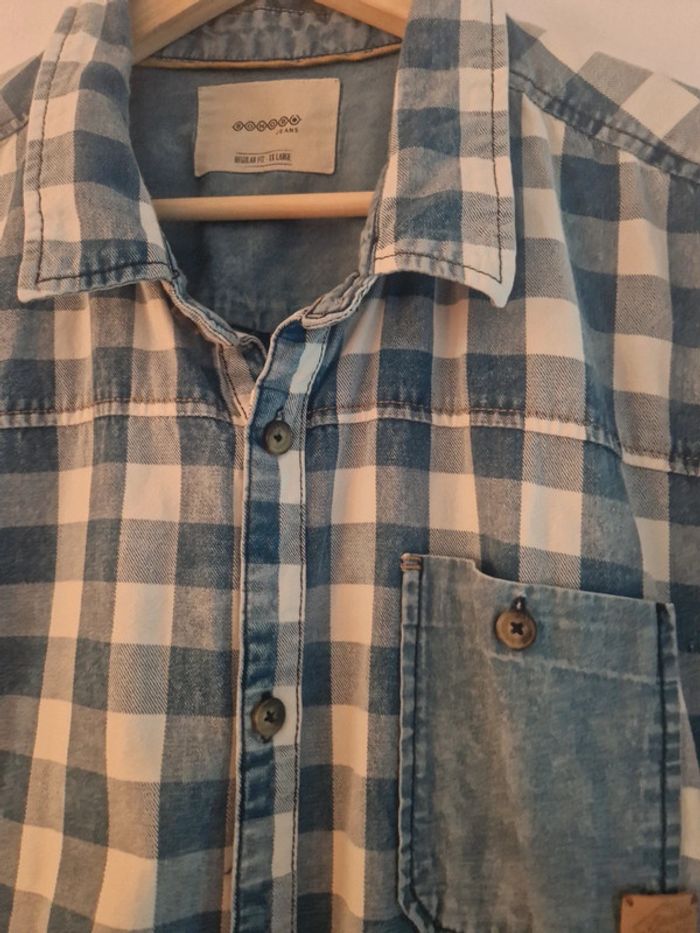 Chemise manches courtes, motifs carreaux bleus et blancs, coupe regular fit. Ttes bon état