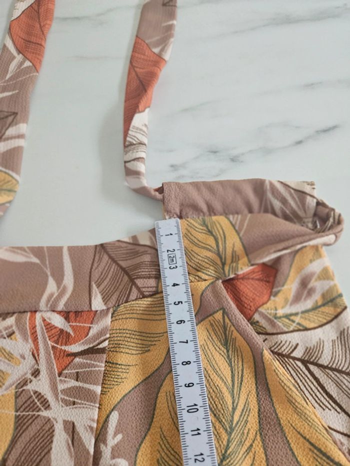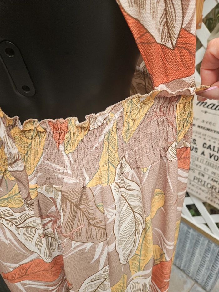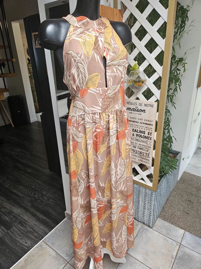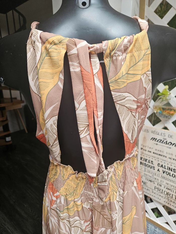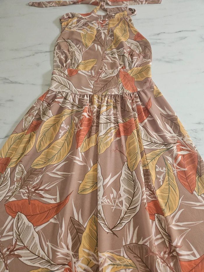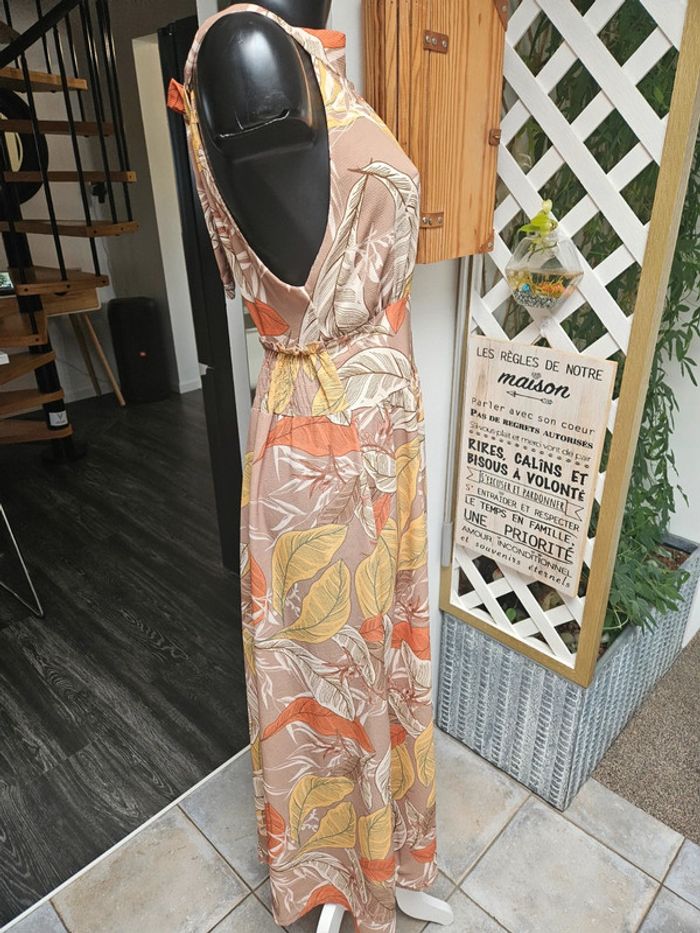 Superbe robe légère dos nu a nouer. Pas d'étiquette de taille mais elle est parfaite pour une taille L. Je fais un M et baille un peu dans le bas du dos car elle est élastique a l'arrière. Portée mais reste en très bon état. Dimensions sur les photos