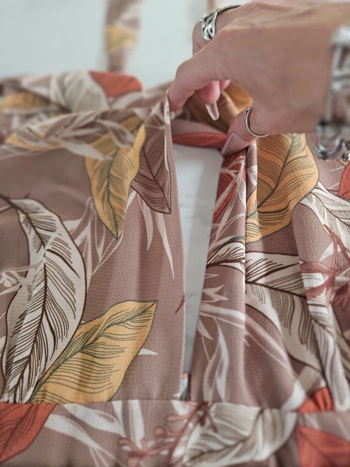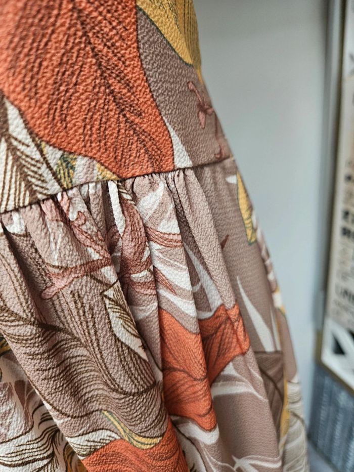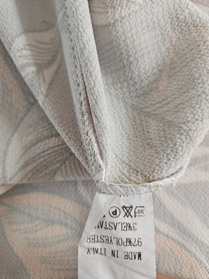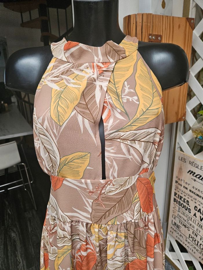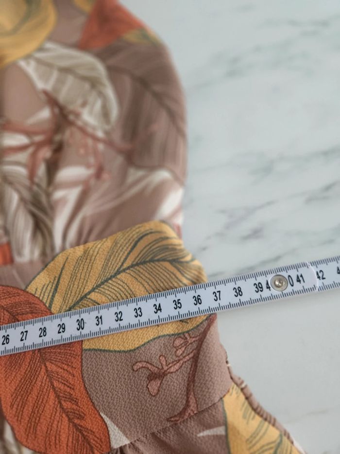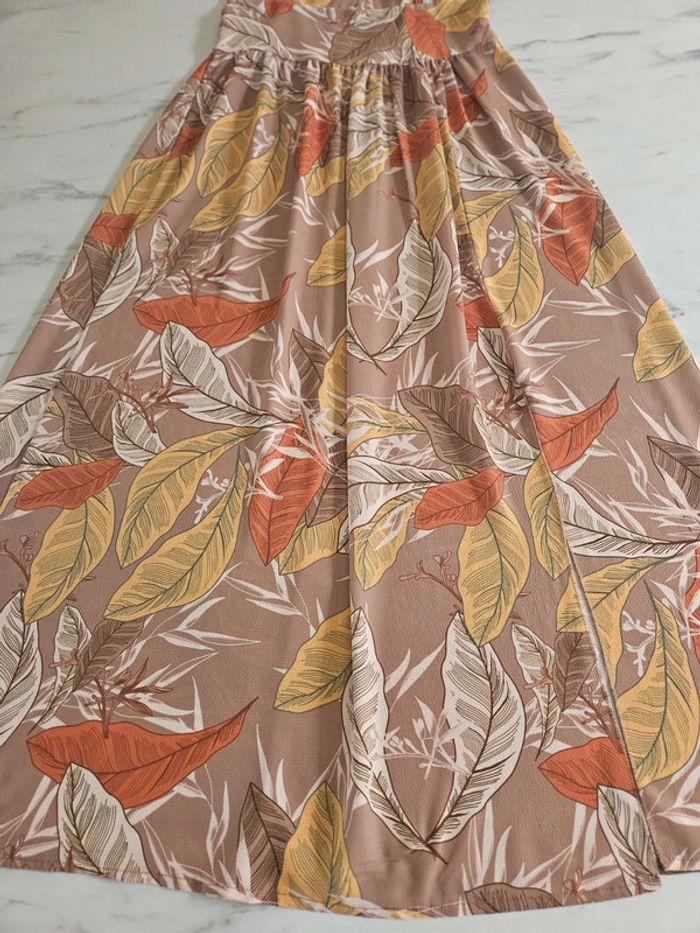 Superbe robe légère dos nu a nouer. Pas d'étiquette de taille mais elle est parfaite pour une taille L. Je fais un M et baille un peu dans le bas du dos car elle est élastique a l'arrière. Portée mais reste en très bon état. Dimensions sur les photos