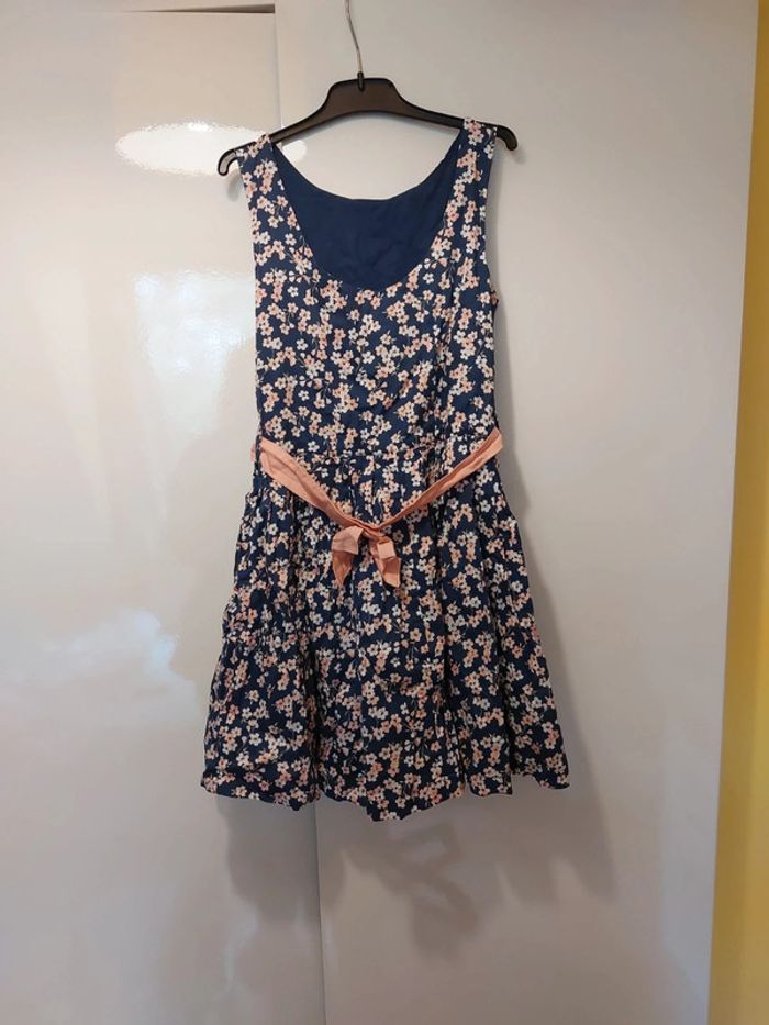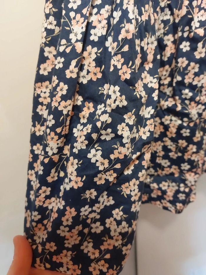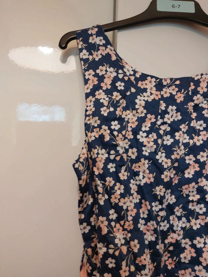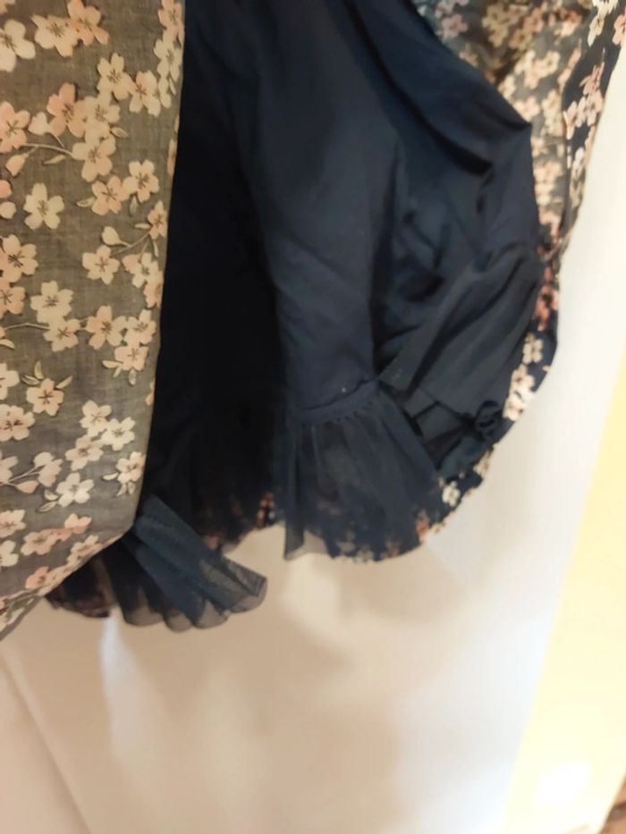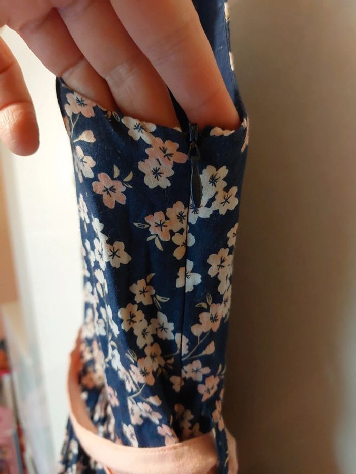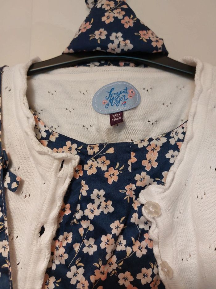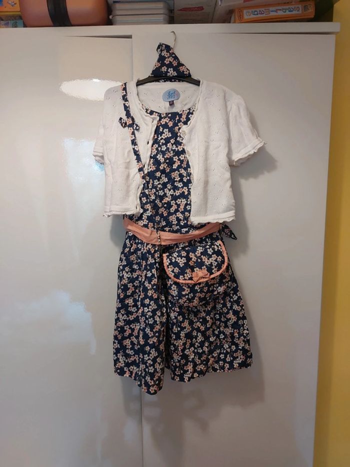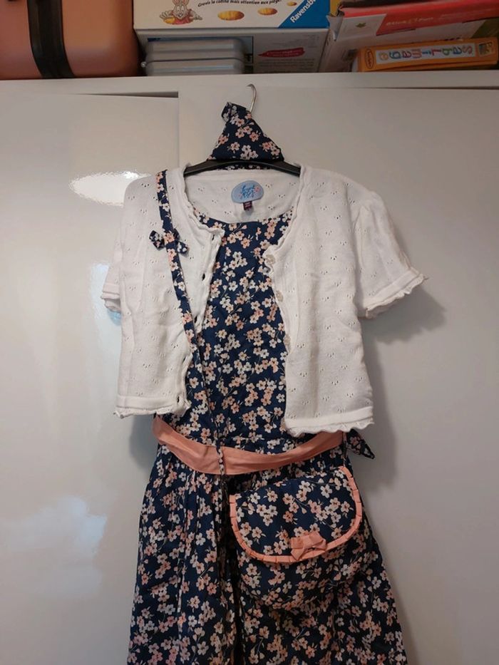 Ensemble constitué d'une robe sans manches, d'un gilet manches courtes et d'un sac à main Robe sans manches Doublée Motif fleurs 🌸 Fermeture zippée sur le côté Robe un peu bouffante en raison de la doublure avec du tulle sur le bas Gilet à boutons assorti à la robe Sac à main assorti Fermeture aimantée Avec triangle en tissu assorti