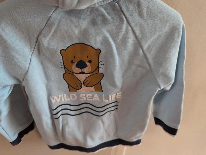 État impeccable Entourés du confort et du moelleux de ce sweat, les garçons ont bien chaud. Une forme zippée à capuche, en molleton non gratté, avec illustration estivale dans le dos.
