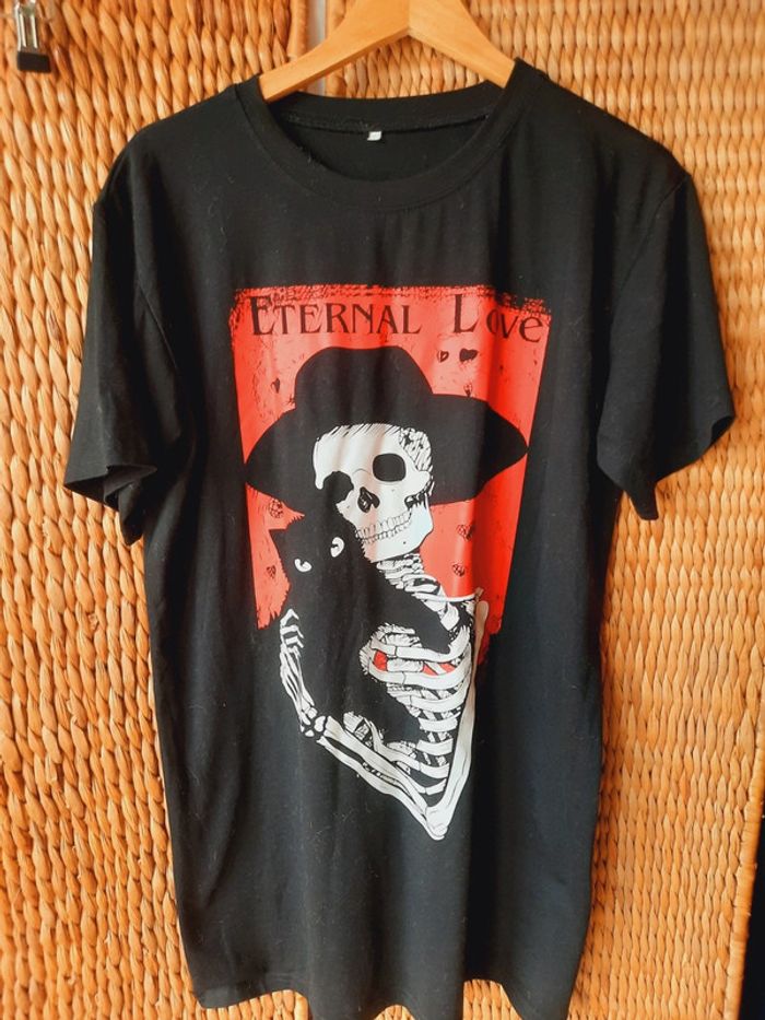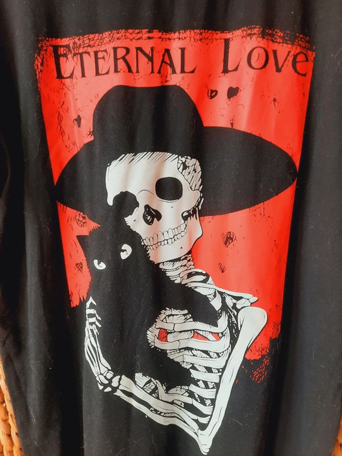 T-shirt de nuit, Eternal love, chat noir et squelette, skull, taille L, très bon état