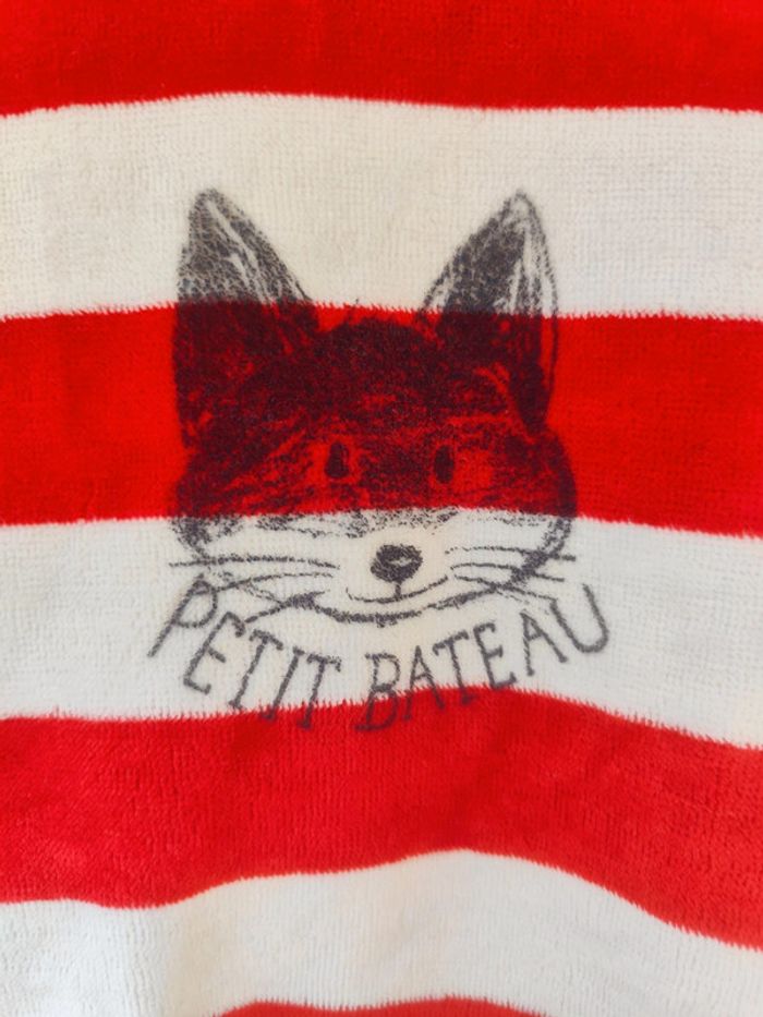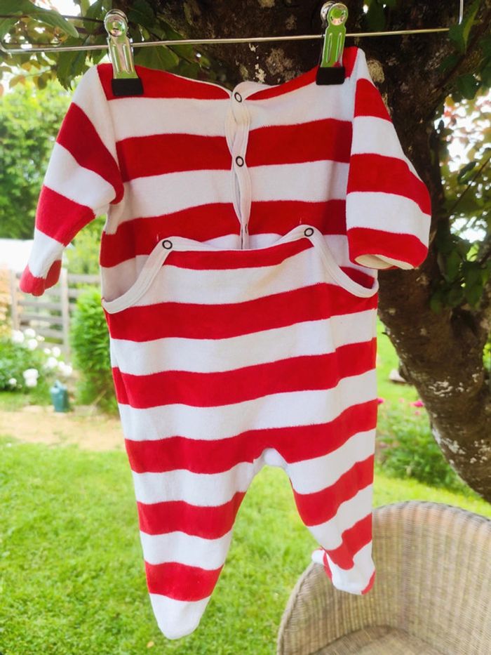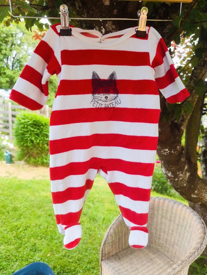 Pyjama Petit Bateau, 3 mois rayé rouge et blanc, boutons pression dans le dos, imprimé renard, velours, très bon état
