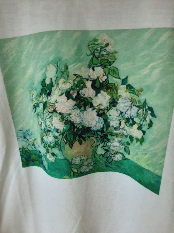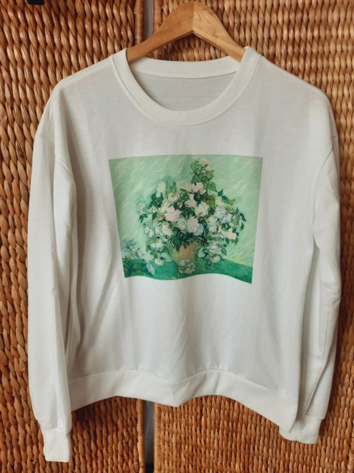 Sweat léger blanc imprimé bouquet de fleurs vert style impressionnisme, 35% polyester et 65% coton, taille M, très bon état
