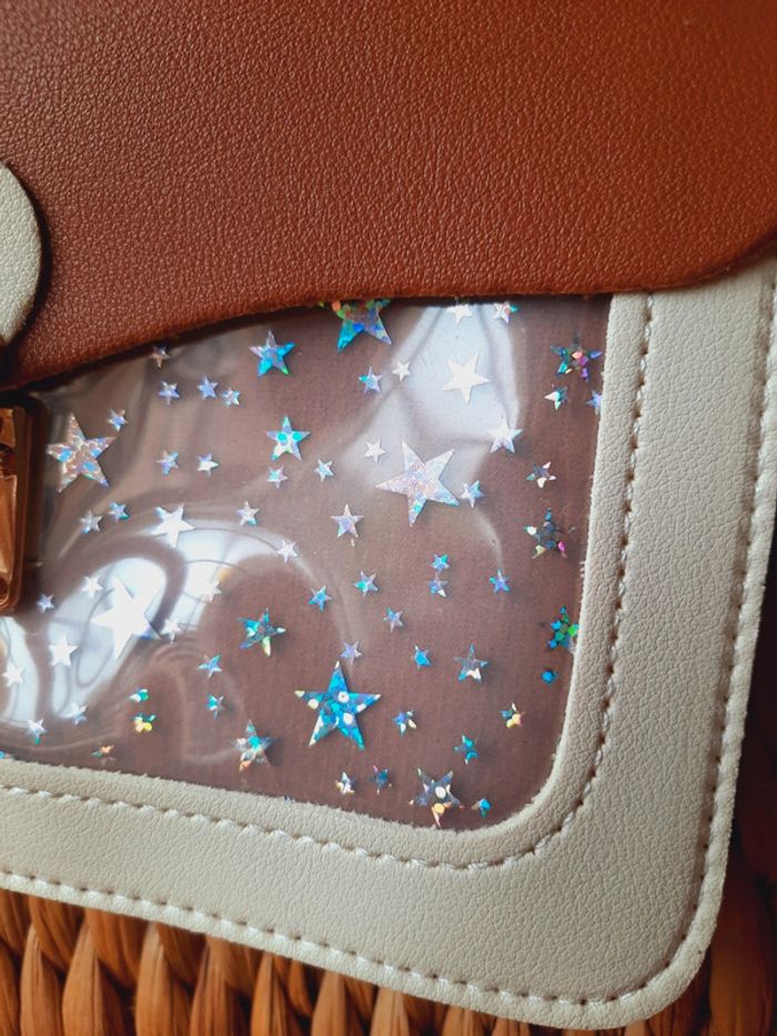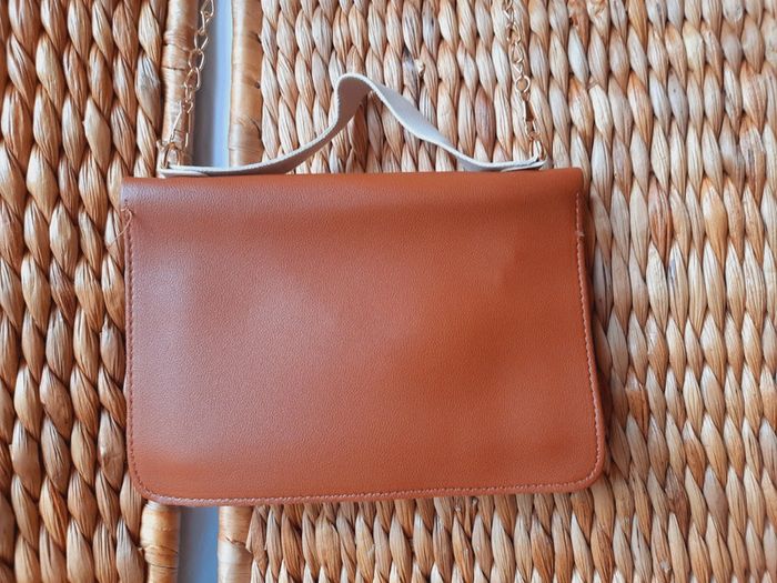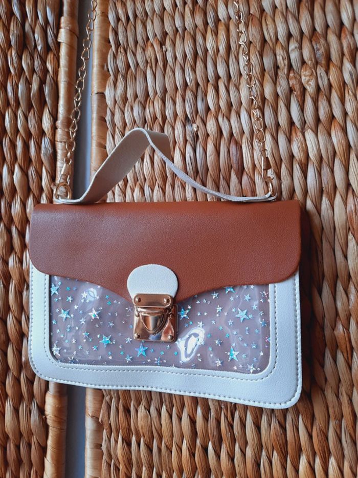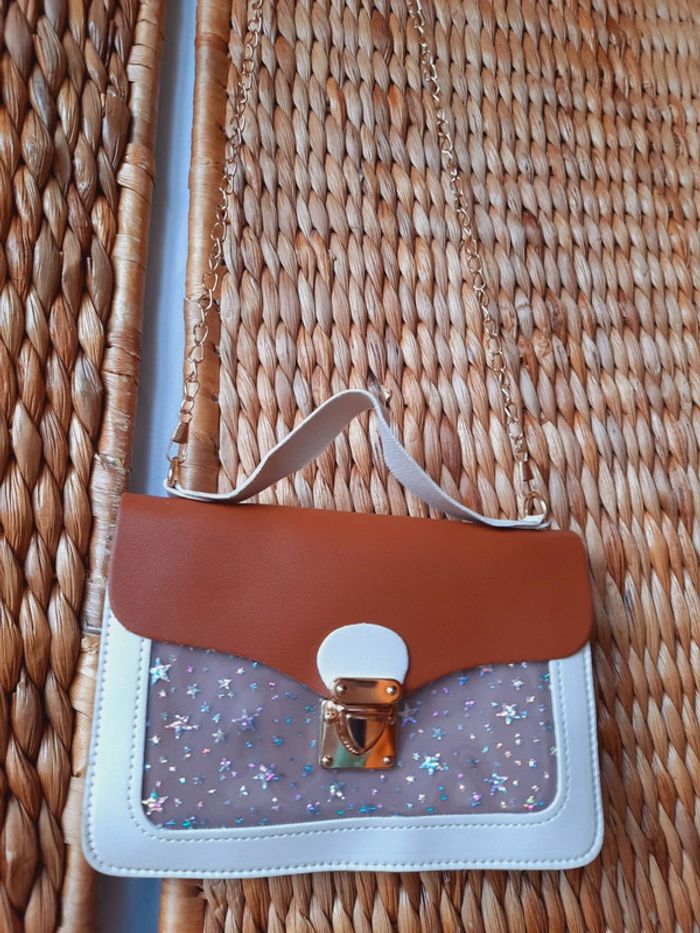 Petit sac cartable bandoulière, bicolore, beige et caramel, avec petites étoiles holographiques, 21 x 15 cm, chaînette dorée, très bon état